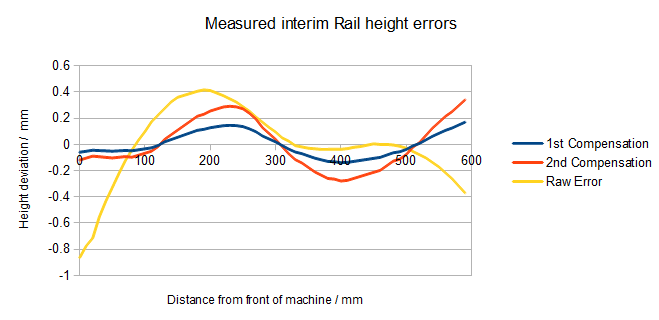 The new error, using the same metric as earlier was extremely small along most of the length of the rail, with a ramp at the end which turned out to be the bearing rubbing on the aluminium resin retainer, which was easily solved, so in the end we obtained a much improved profile accurate to +-0.03mm. Just to emphasise how well the resin worked, here's the original frame error, the first compensation attempt and the resin plotted on the same scale: