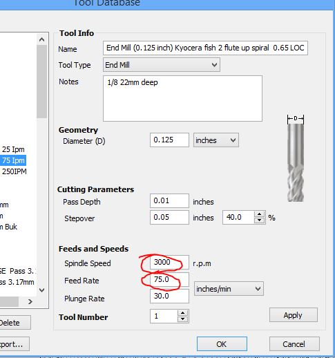 2. These numbers also work for engraving /v bits/. However for bits with included angle 45 and 30 degree is better the feedrate to be 25% slower, cause will easily brake tips. Same is for thinner than 1/8 bits or long bits.