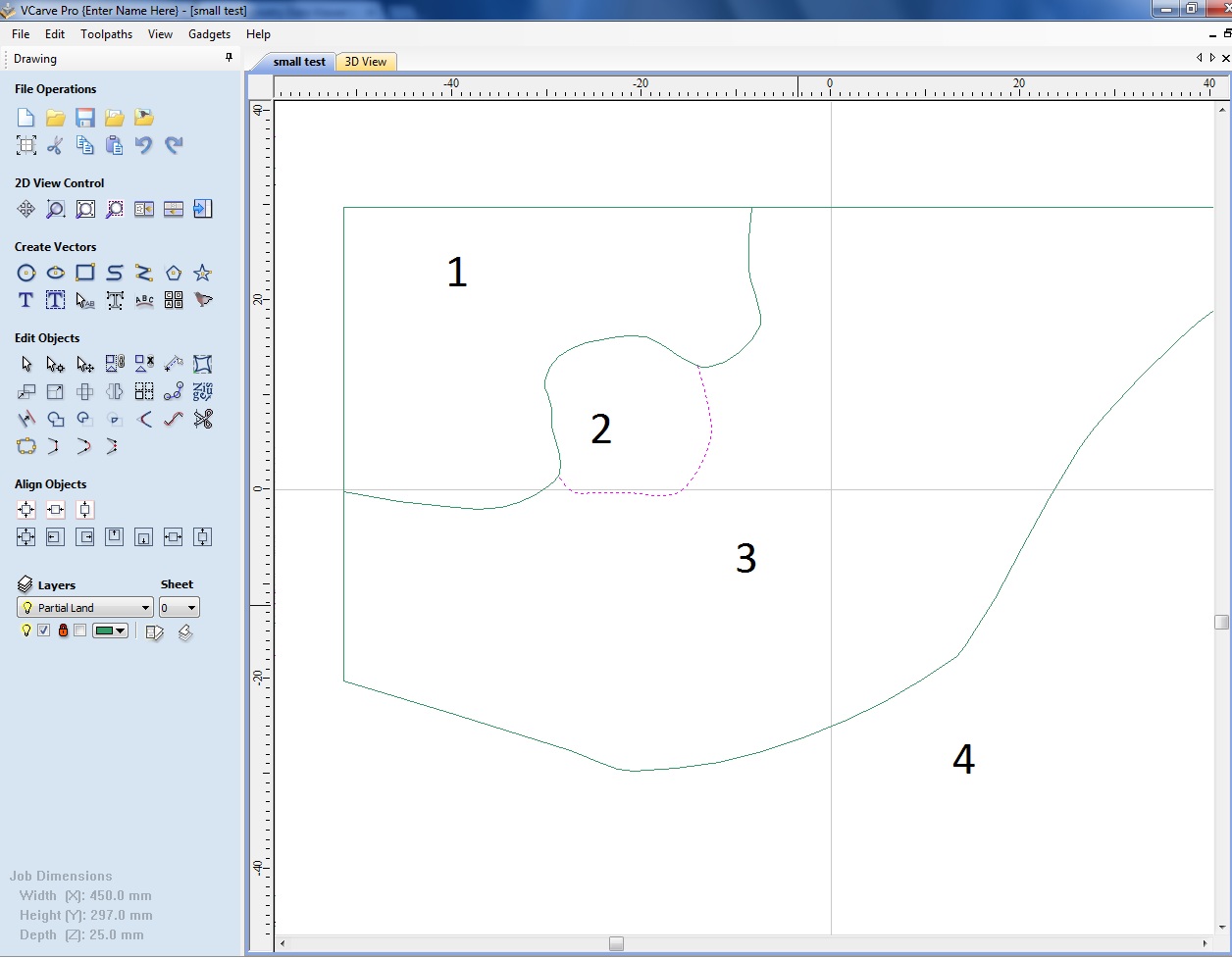 In the below example, assume a block 20mm thick, with section 1 on the face, section 2 being a 5mm cut, section 3 being a 10mm cut etc. Where 1 meets 2, I cant seem to 'close' the vector for part 2.