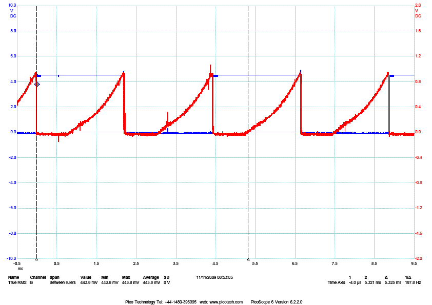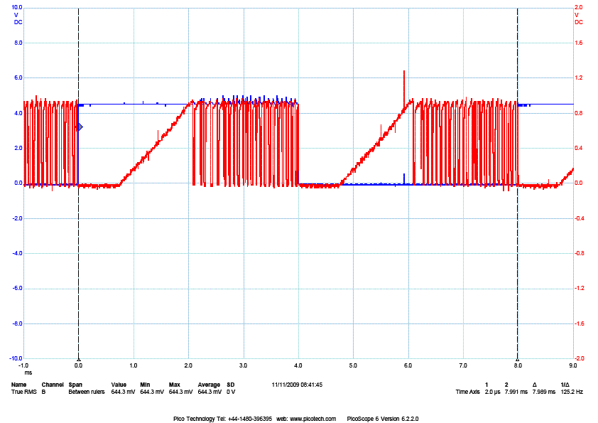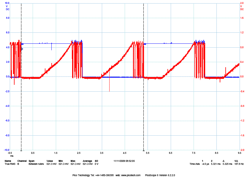 The next 3 pics shows the voltage across the sense resistor (a proxy for the current in the winding) at different step rates for a fairly high inductance motor running on 36v supply and 1.4A. The inductance of the winding is what limits the rate of current change so you have to drive the winding hard with a high voltage to get enough current flow to get useful torque at any useful step rate, but then you have to limit the current to avoid frying the winding. If memory serves, these are at 75, 112 and 133rpm. You can see the initial slow current build up followed by the chopper action. In the last pic the current limit is never reached - above this speed the stepper will generate less and less torque (in fact by 300rpm it hasn't enough torque to overcome its own friction and stalls). This motor should ideally be running on 100v to be useful above 100rpm, and this is a 1.5Nm NEMA23 motor with a 1.4A/2.5v winding.