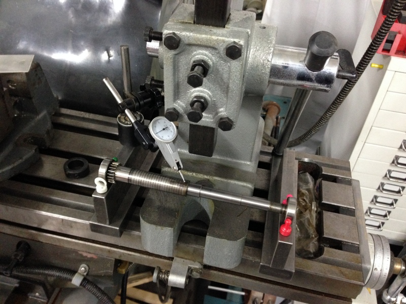 On to my makeshift metrology area, table saw top, and some parallels plus some magnets to stop it all rolling away. Oh 0.45mm runout at the binding gear. The shaft has a thick section and a thinner length shrink fitted in to it, I think. In either case the bend happened at the shoulder where the gear mounted.