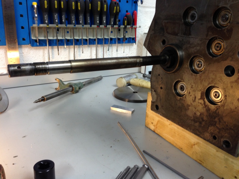 This shaft has a gear attached on the end once the gearbox end plate is back on, it forms the ratio that converts between metric and imperial (or vice versa). The other gear is mounted on the end of the cluster gear shaft.