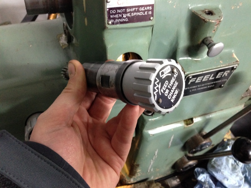 With the gearbox back in place it is time to add the feed/threading selector. On the Feeler the flat is on the left and I put the knob in the thread position. Then align the idler so that it runs on the gear on the spindle.