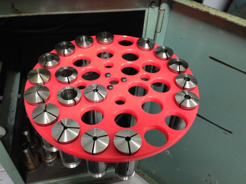 I've decided to slow down a little and put panels back on etc and clean up while I get some other stuff done. This would be easier without a table covered in collets so time to sort out the collet carousel. One of the original perspex ones has cracked, it was held with cable ties when I got the machine.