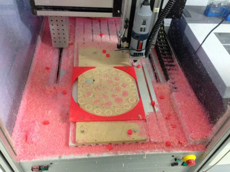 I could remake from perspex but it is likely to happen again, instead I'll use something softer and tougher, a catering chopping board, less than a fiver from the local cash and carry and just big enough. After some time in the CNC router: