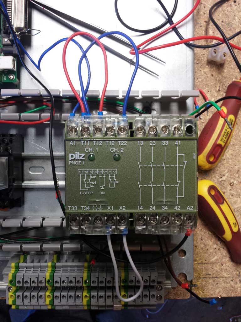 I have moved onto getting my control box working utilising drawings from the Mechmate plans and Eddy Currents major safety circuit and this is where I have hit a wall. For some reason my PNOZ1 is not playing ball and is throwing everything else out as it is a major centerpiece of the safety circuit.
