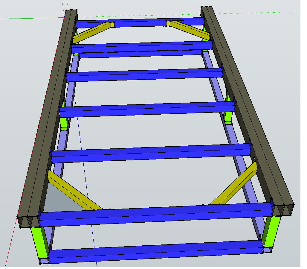 Lifes not easy at minute so no enthusiasm or time to play or respond but I'll give a little input.!! . . . I would make the base in 3 or 4 main sections that span from side to side then connect with diagonal braces for strength. Sit the long rail beams on these then have supports for the bed between the beams.