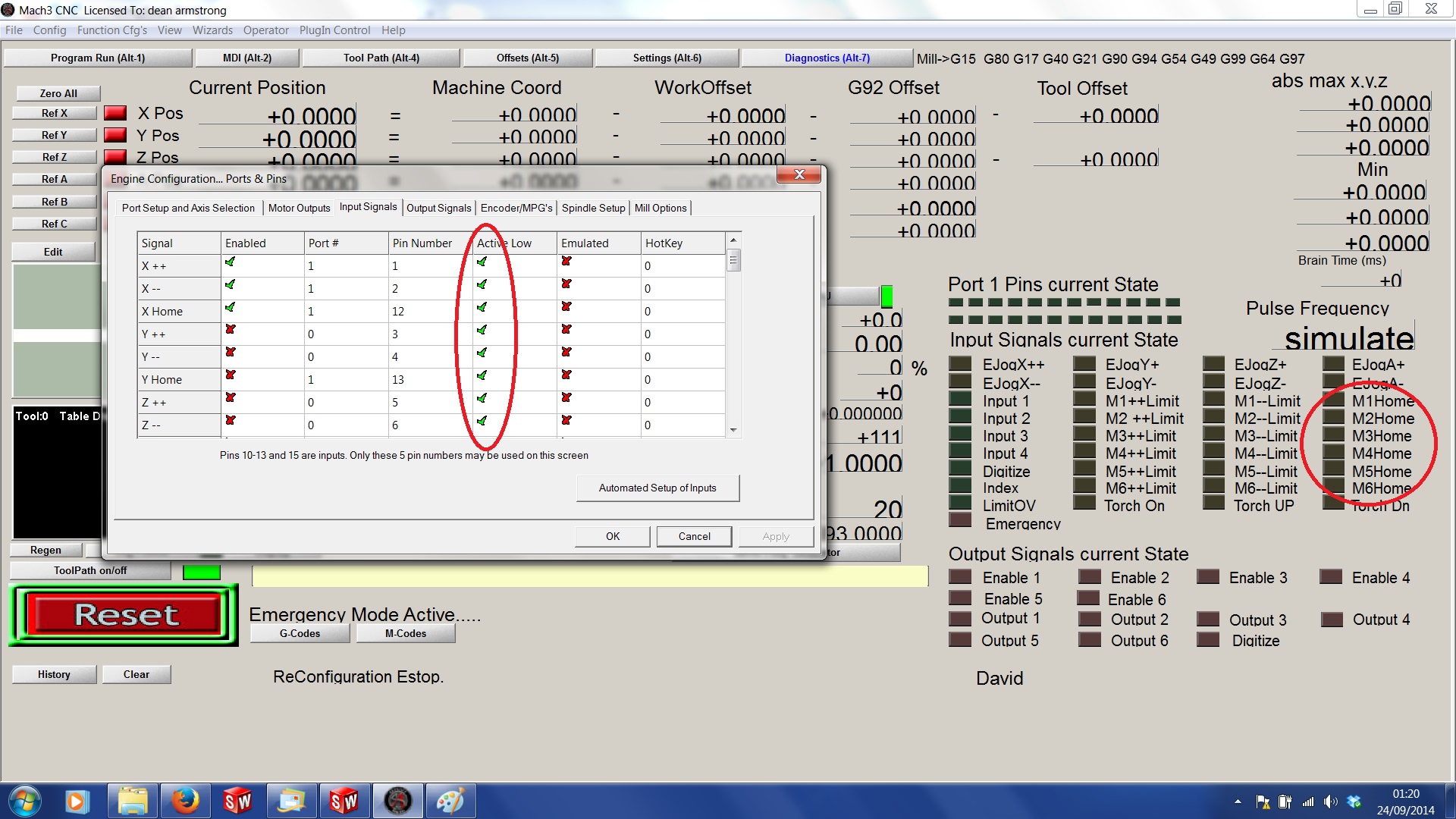 Next go to diagnostics and see which axis M1, 2 or 3 Home led is lit up. Then go to Ports N pins and select inputs, find the axis which is lit and change the active low state of the pin. So if green tick change to X and vise versa.