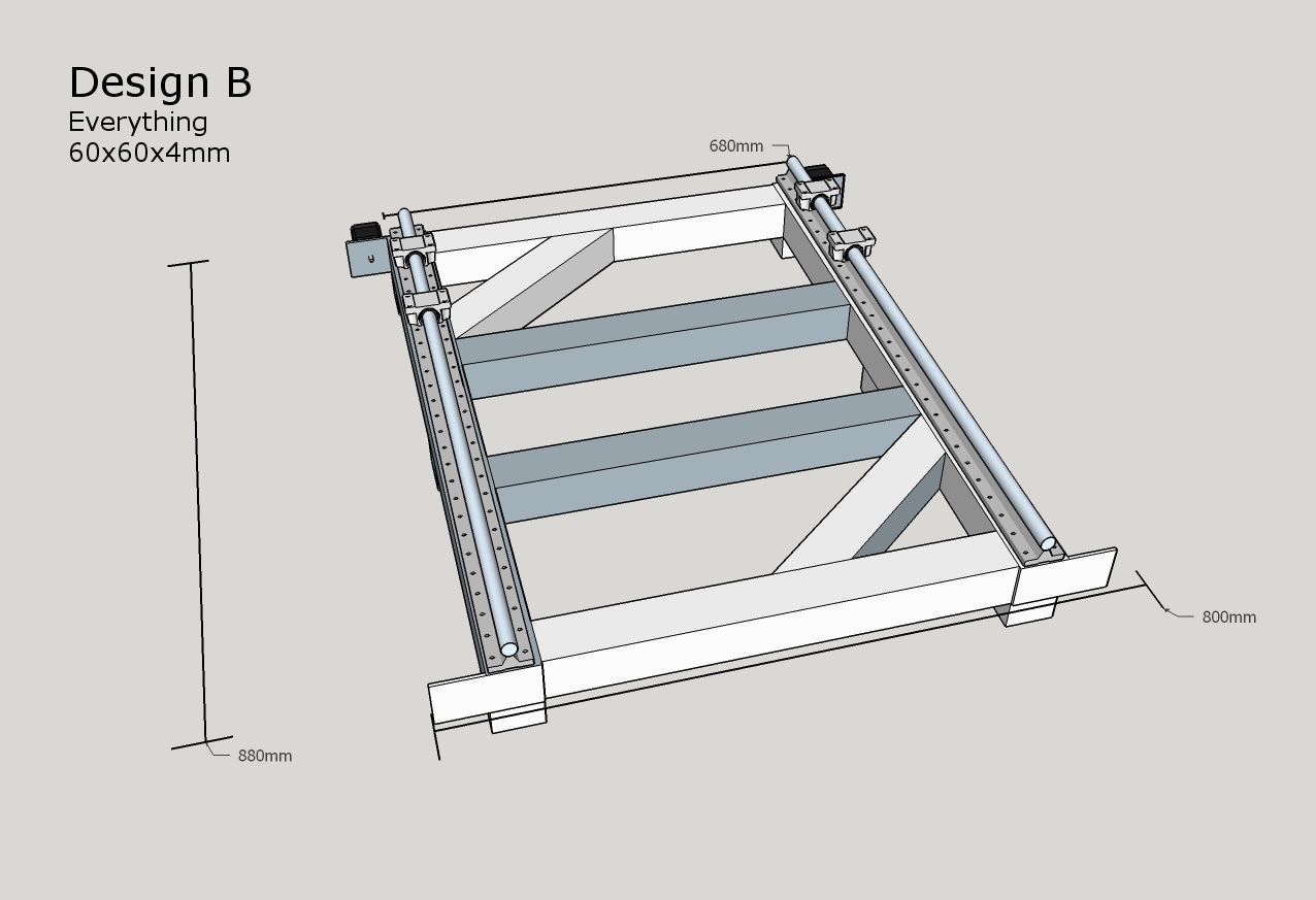 My goal is to make a simple strong build which will be able to cut hard woods and aluminium at a reasonable speeds, I only have room in my workshop for a machine off 900mmx800mm I have done three design off the base A,B,C which I will upload, my abilities on sketchup are also pretty limited so I hope you can make them out ok.I have done the design using 60mmx60mmx4mm box which I would have to buy but I do have 50mmx50mmx4mm box in stock and if I could use it it would save me a few pounds. I can weld ok and hope to weld most off the build and limit the amount off holes to be drilled.I haven't designed a gantry yet as I wanted to get the base right first.My build budget is Around £1500 mark.