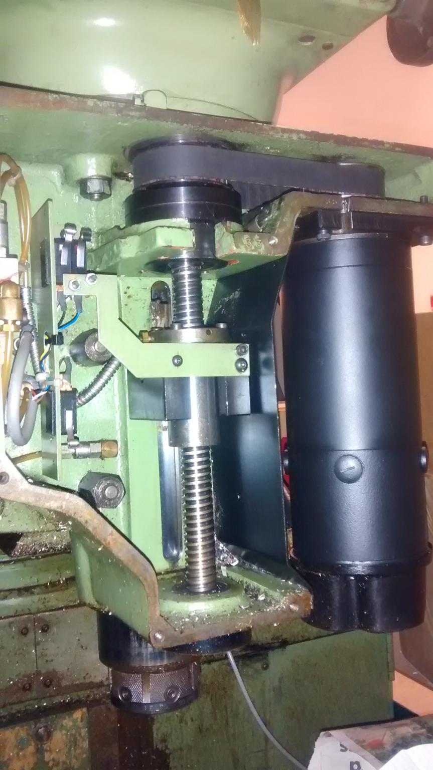 Bracket attaches to the quill via the 'vertical' slot. This bracket also contains the ball nut. The ball screw is mounted externally of the head fixed top and bottom (obviously) a timing pulley it attached to the top of the ball screw, then the motor is mounted in close proximity to the head timing belt transfers the motion to the screw.