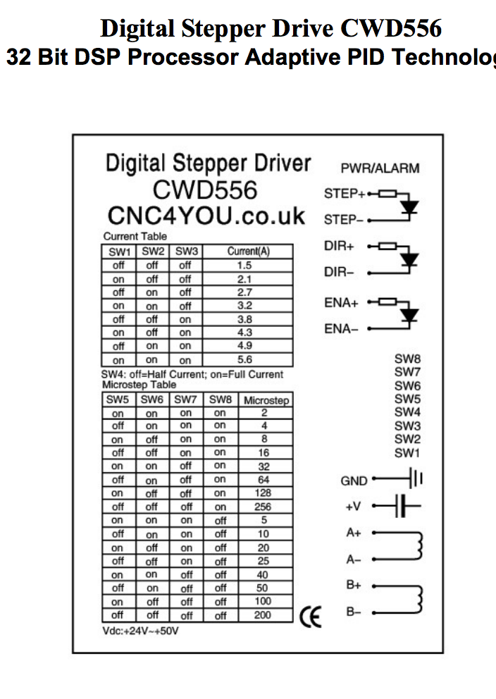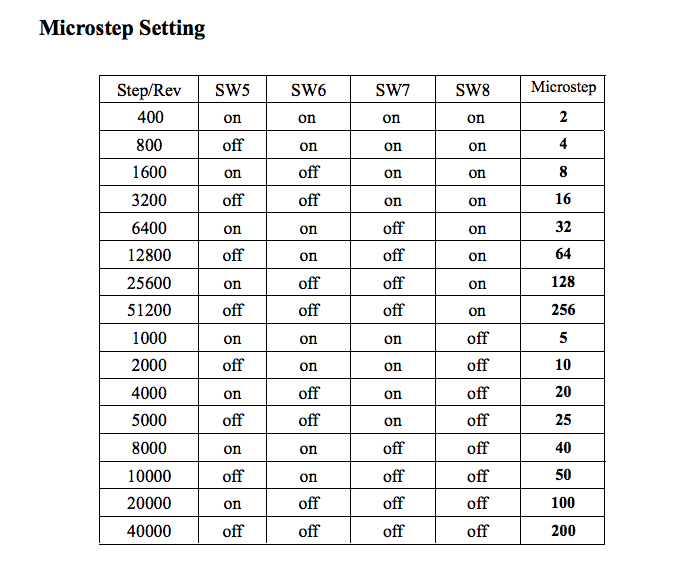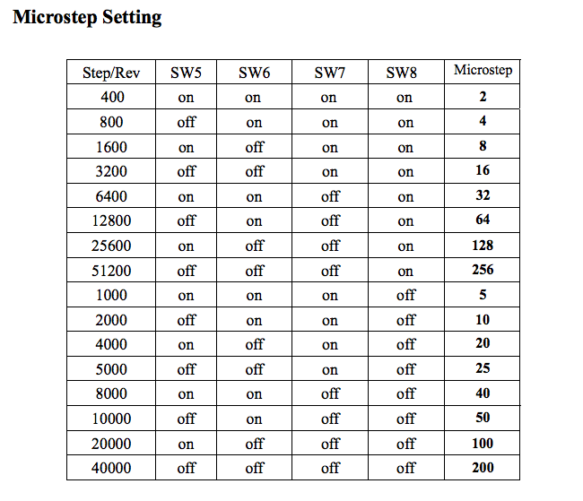 It is sw5, sw6, sw7 and sw8 that confuse me - I dont know what microsteps are or what effect these settings will have - so I cant make a guess at which setting to choose from the chart above and how this affects the "steps per" value in mach3 "motor and tuning setup screen". The default of steps per was 2000 - I reduced it to 200 as per the advice above but I still dont know why exactly. The following chart shows even more info...