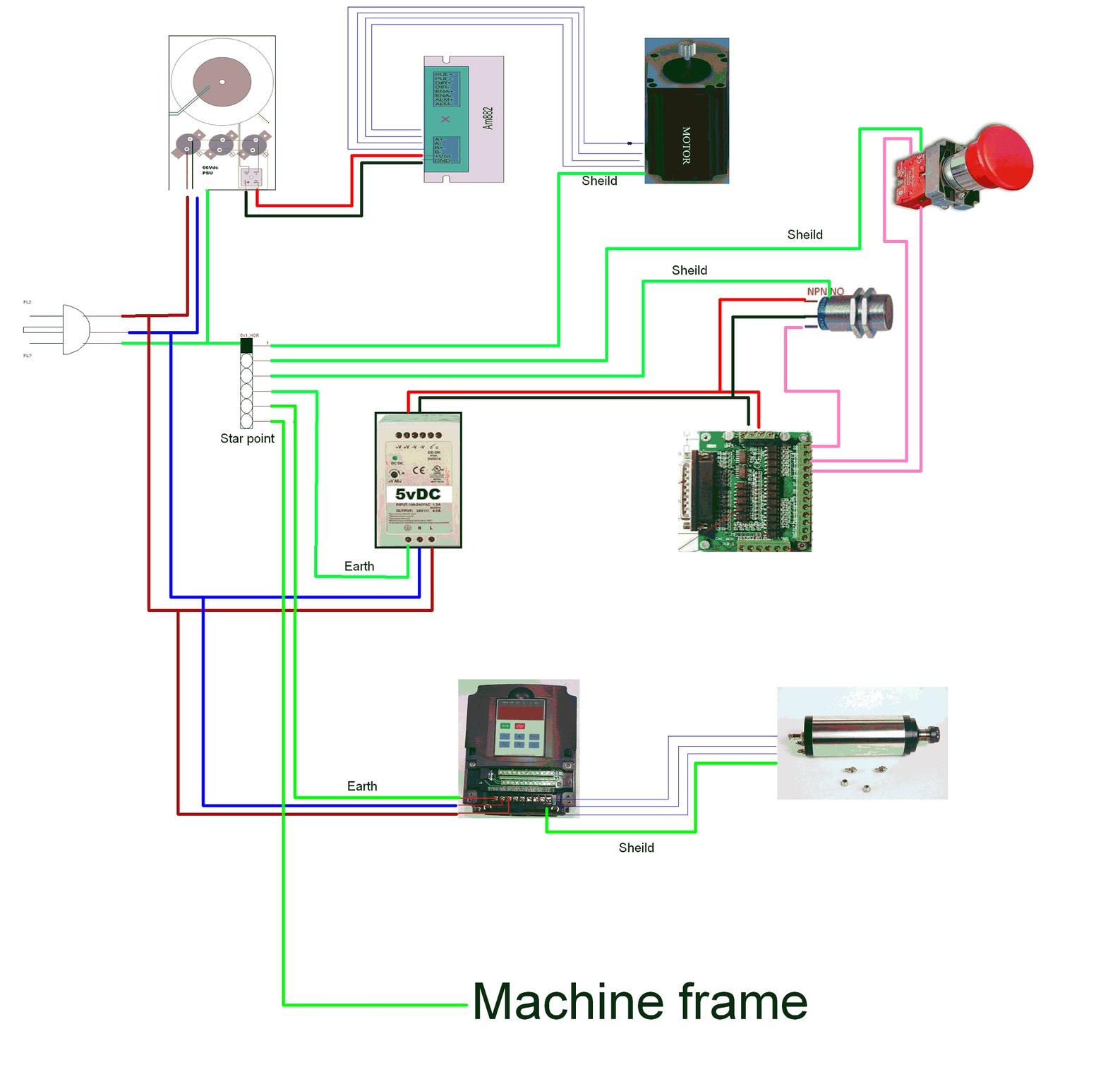 Connection are made it with shielded cable (CY Cable 4 core's 1.5mm) between VFD and motor, controller and stepper's, power for the second box (with UC300 + HDBB2).