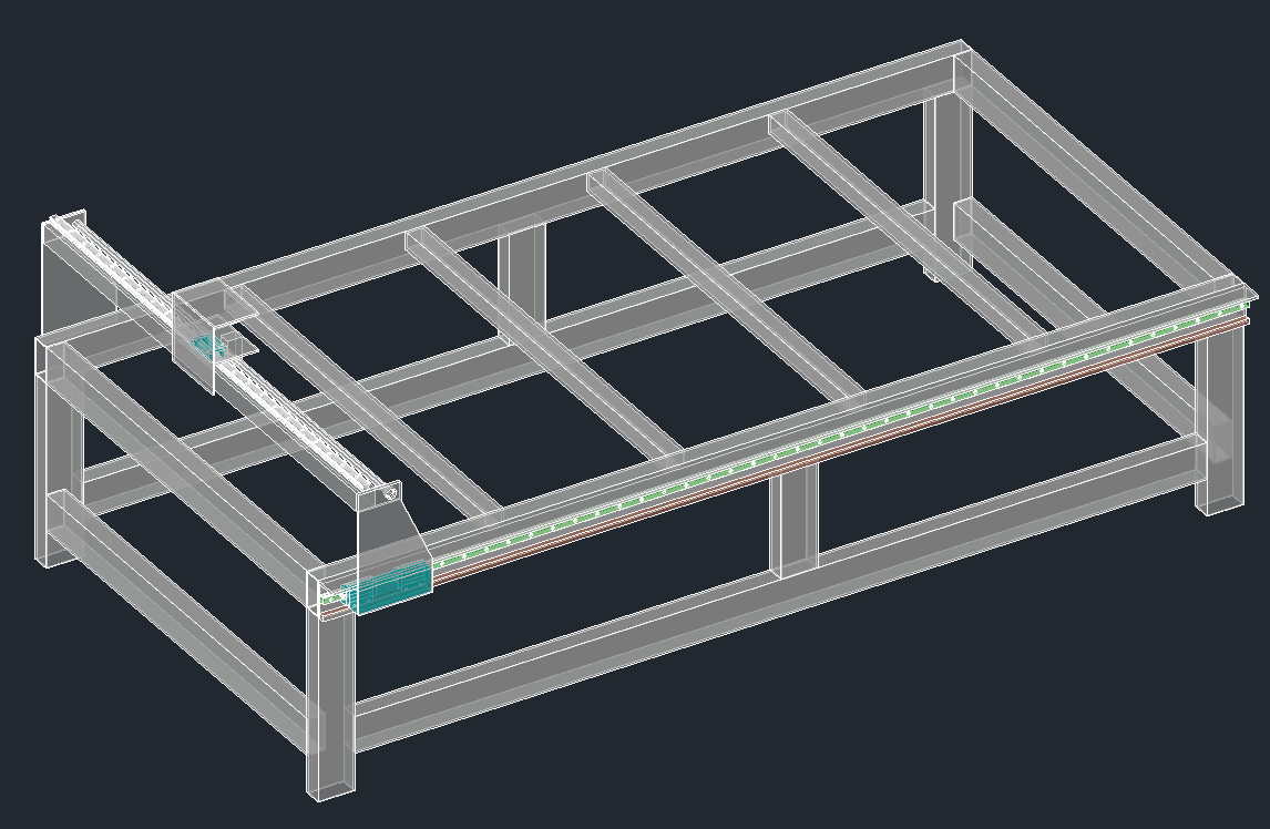 Posted some pictures below. The length of the table is 2500mm. The main structure from 50mm x 100mm 3mm steel tube. Looking at rack and pinion for the X Axis and Lead screw for the Y. No detail on hardware yet just looking at getting the overall form right. In particular how best to attach the X Axis rail and pinion rack to the main structure. Considering bolting the rail and rack onto an angle profile, then bolting onto the sides of the main structure. Comments especially welcome on this. I read on this forum welding the steel surface of the rails is a bad idea due to warping. Attaching on a plate separately would allow for a fair but of shim. Look forward to any comments/concerns/suggestions anyone has. Many thanks in advance.