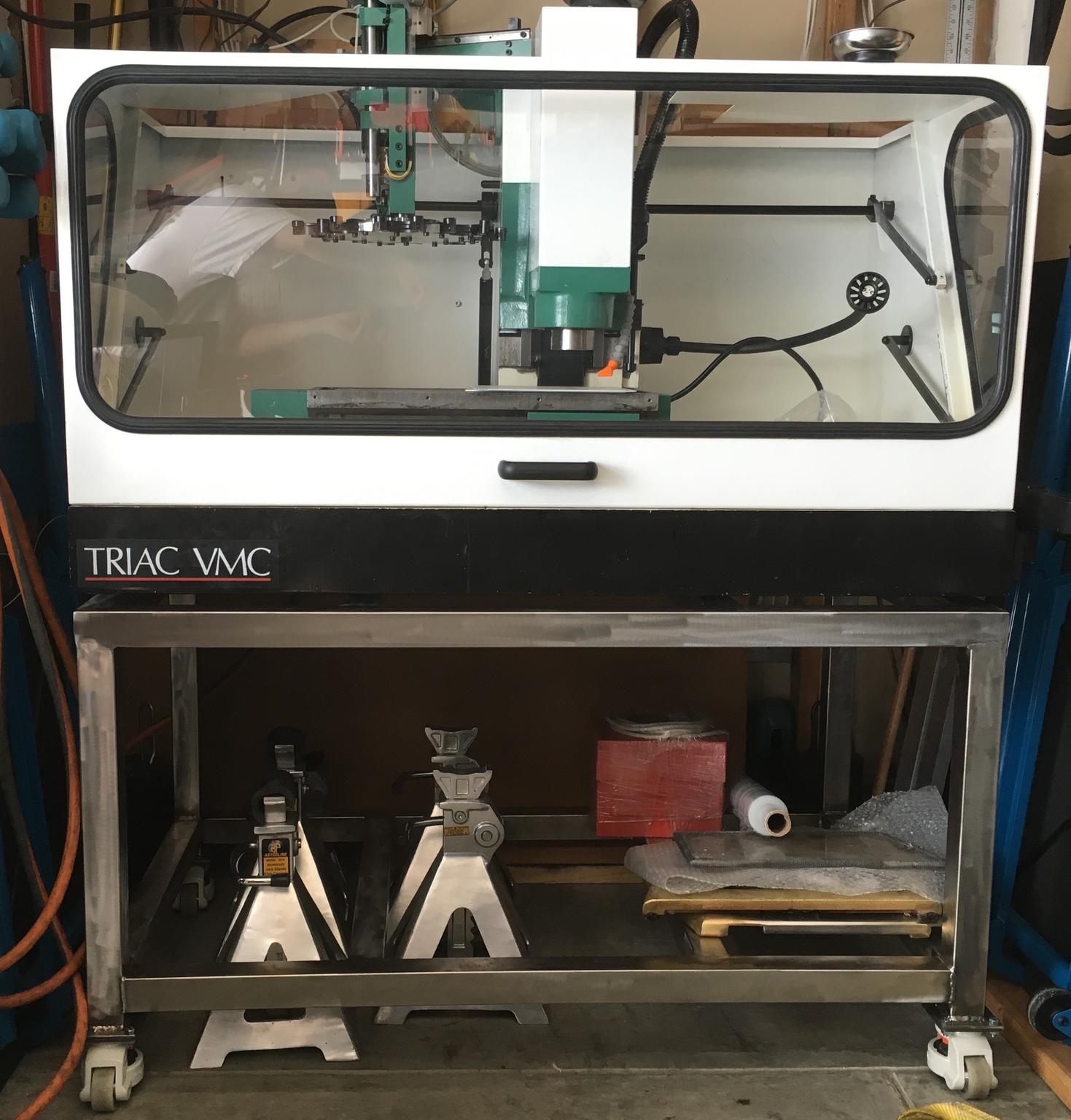 I have a stepper one (not a servo), but the conversion should be close to Chaz's. The first thing that I did was weld up a stainless steel table on adjustable casters. The funny thing here, with all my great wisdom, is that I first made the table tall enough to fit the control box under it! Unfortunately, my thinking in the beginning was totally off. I didn't realize how bad it would be to work on a step stool to get to the machine. So I bit the bullet and removed the machine off the stand (what a pain) and cut the table legs down and re-welded it. It looked much better the first time. :disturbed: