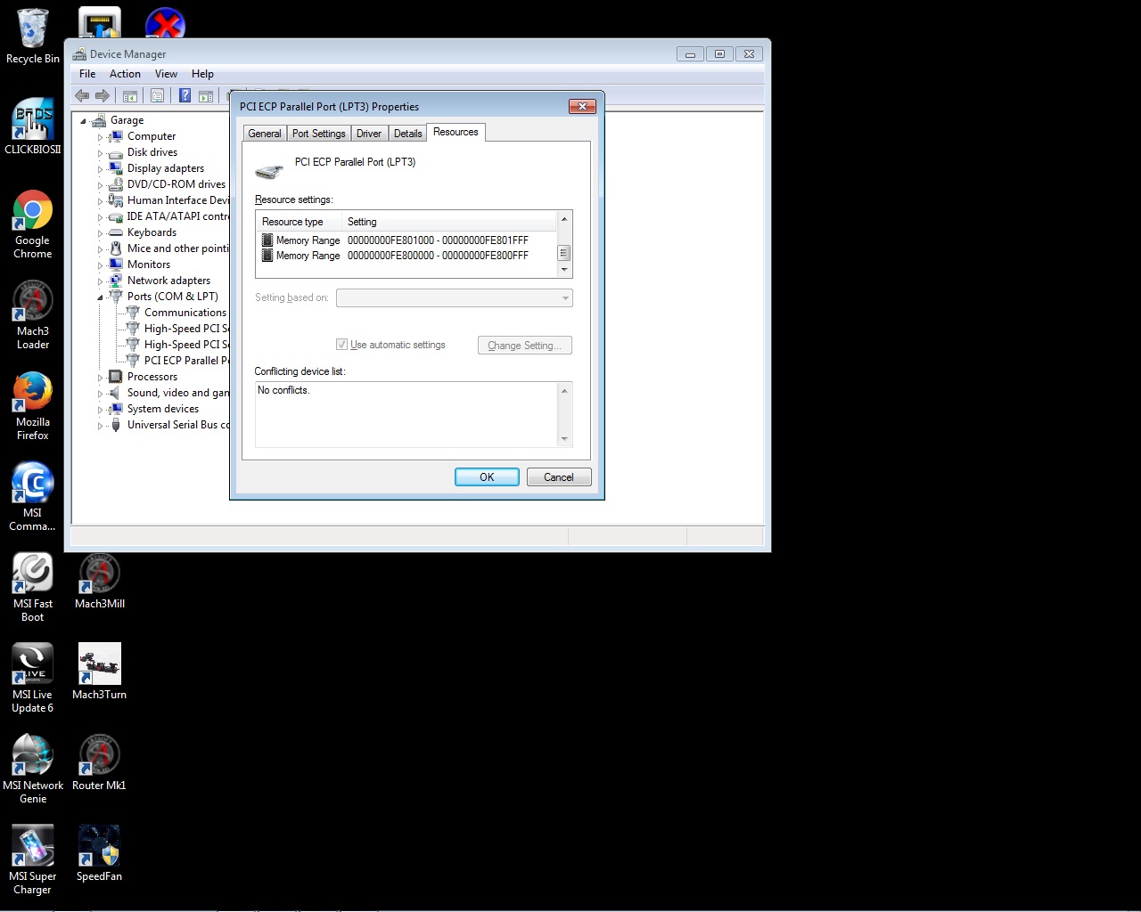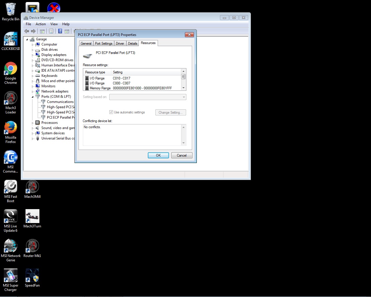 the parallel card uses automatic set up and can't be altered , in the general tab it says it's working properlythe part to do any change is greyed out. Not keen on doing the graphics card, this is all a bit beyond me