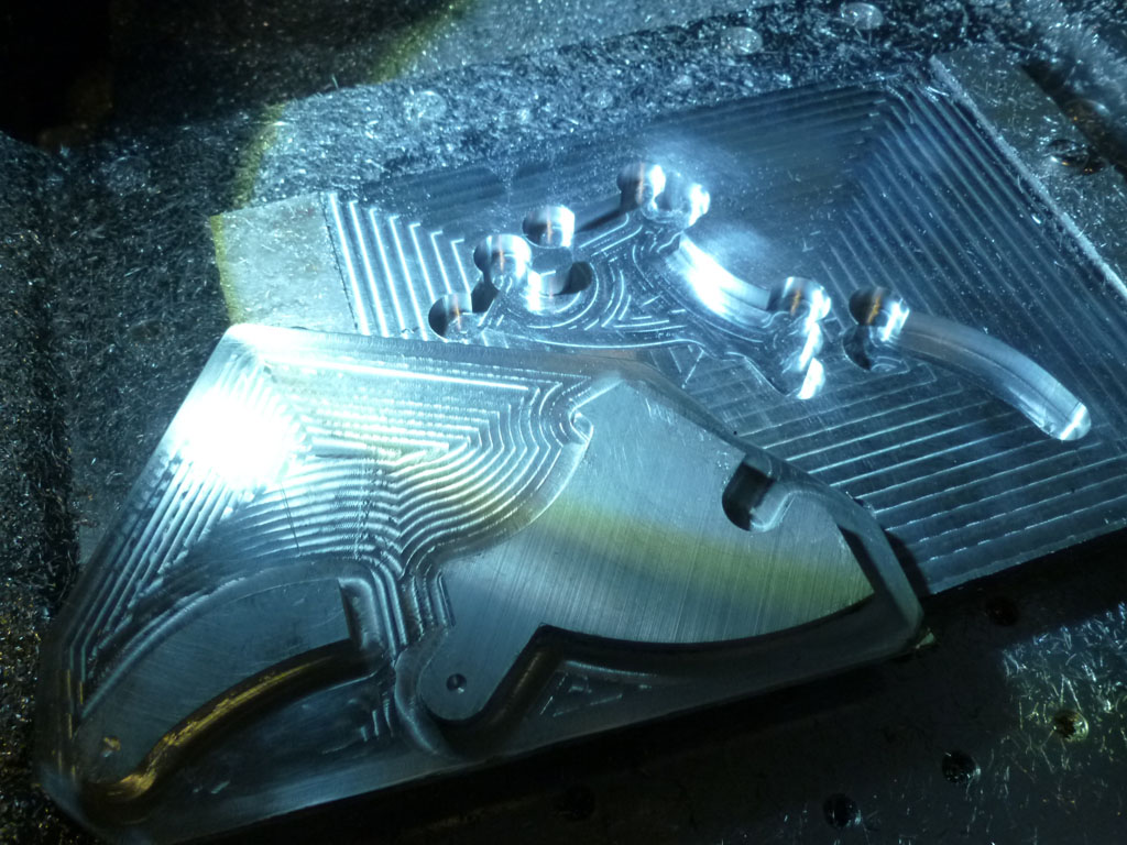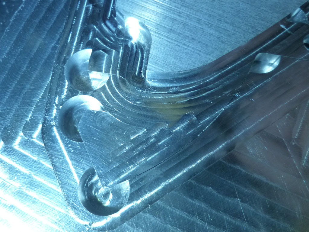 Hello all - hopefully the above images will give you an idea of what's going on: a 2 sided part and a holding jig. In the last two pics the second side has been machined and you can see how the part and the pockets don't quite match up and the holding pockets have had to be cut a bit bigger than you'd expect to accommodate for what I think is skew - but hey, there might be a bit of backlash in those Chinese screws so it could be a combo of both those things... (it's barely perceptible, but I get a click pushing on the table when the motors are energised and holding - and that ain't what I want).