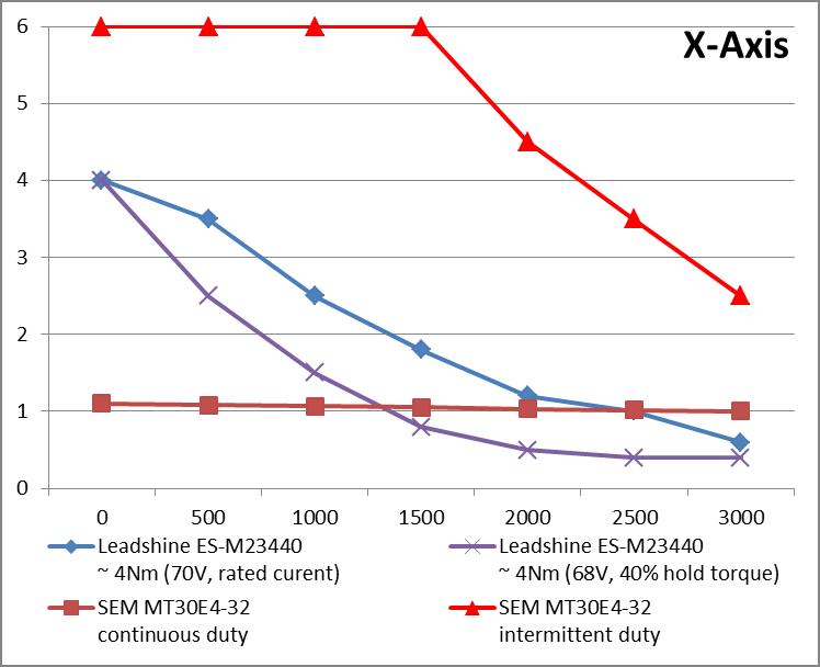 Second question – if I go down the closed loop stepper route I was thinking of ES-M23440 & M23480 units. Again I found a few curves and plotted them as below. The ‘70V / rated current’ curves that I found suggest torque above the continuous rating of the servos up to 1500rpm, but then another curve marked ‘68V 40% holding torque’ makes things look more marginal marginal….or should I in fact be looking at the intermittent capability on the old servos? This is where I am confused – will these units be OK for this application?