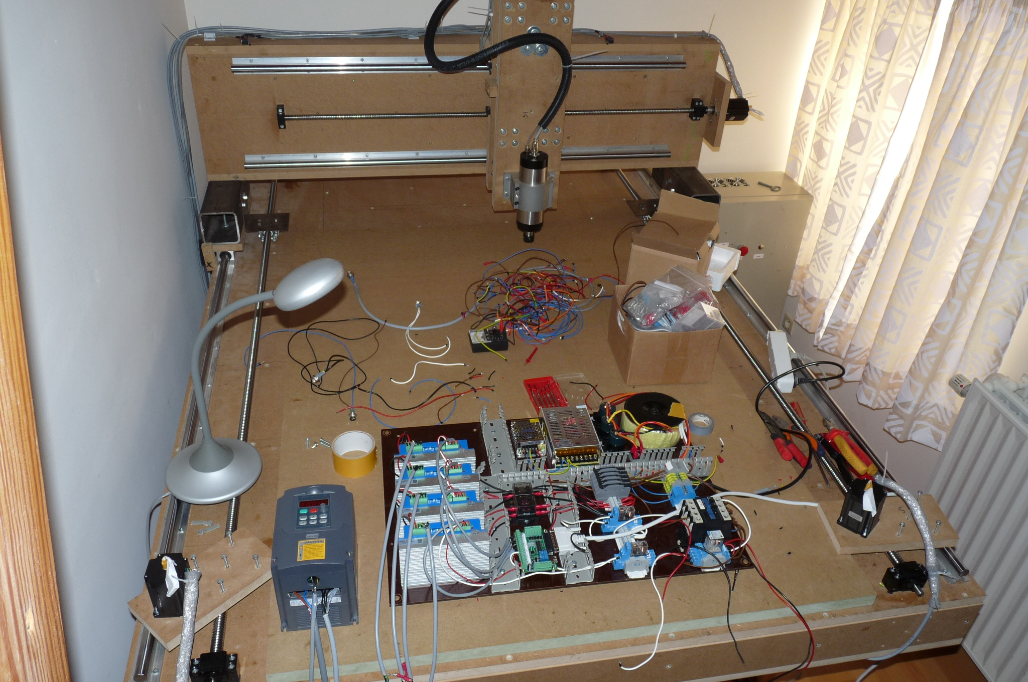 The machine has a 2300x1800mm footprint, and has a working area of about 1500x1000x15mm. It is made of 24mm thick MDF, weighs about 300kg. The router is a 2.2kW water-cooled spindle with VFD. I've got a nice control box, works like a charm with 4xAM882 drivers, 4x4.2A Nema23 425oz.in motors, 70VDC linear PSU, and all the main safety things required. I've got SBR20UU on all axes, and Z has an SFU1605 300mm long, Y an SFU1610 1300mm long, and X has two SFU2010 2000mm long.