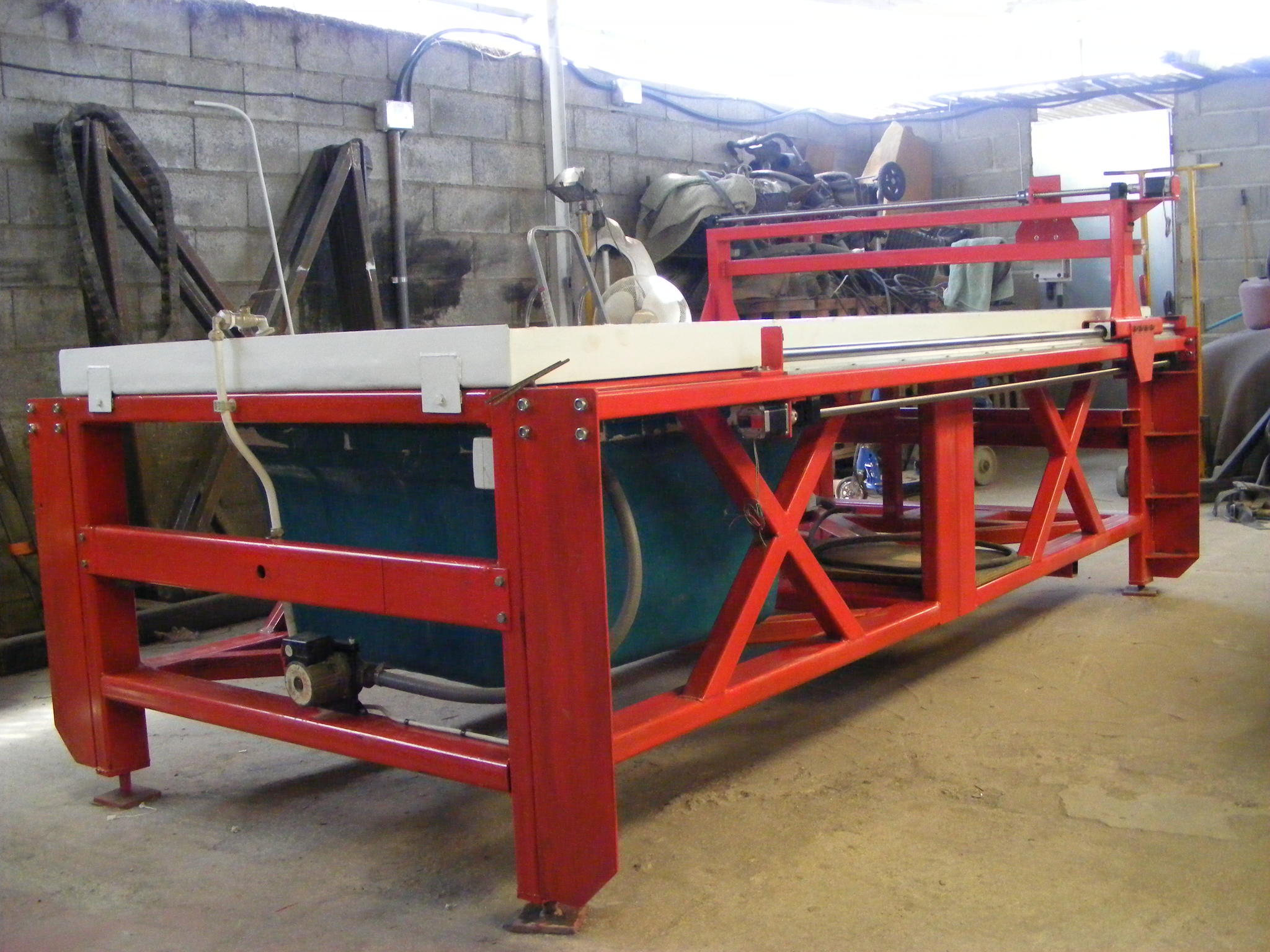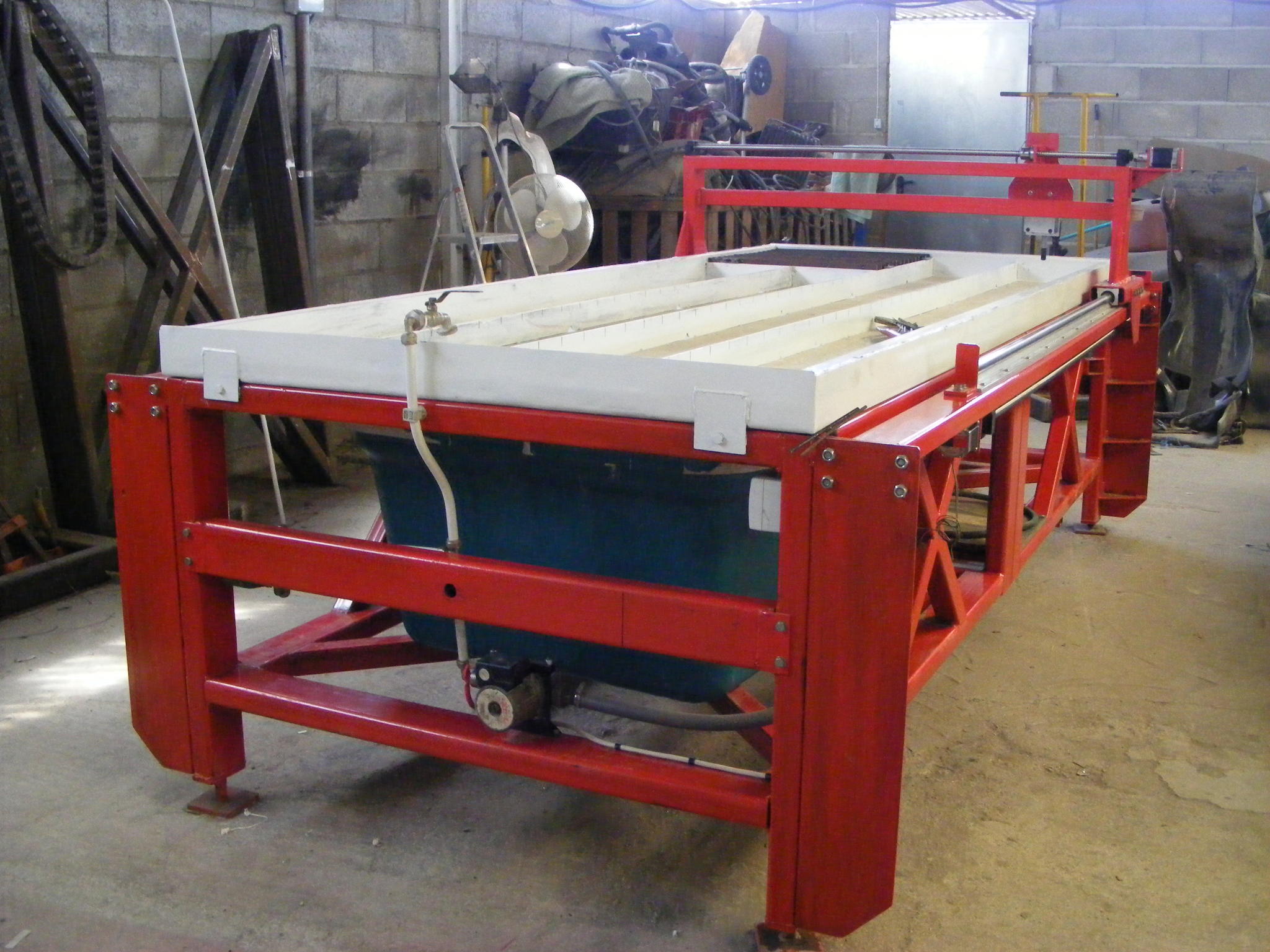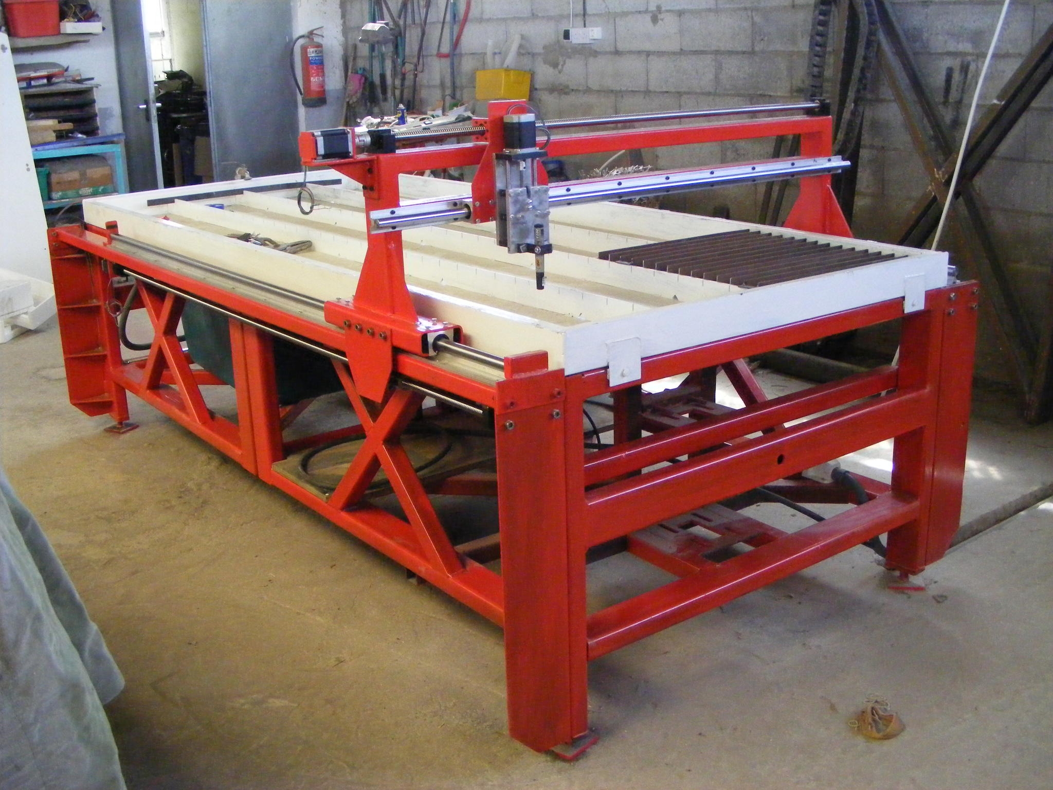 I've made an attempt at building a 8' x 4' water table. Ballscrew x, y, z axis (z axis with 150mm travel was purchased complete off ebay) Currently awaiting delivery of a Hypertherm 45 with machine head. Photo's to follow - please note: constructive criticism greatly appreciated as i've got to learn. Have 3 x nema23 motors (Japanese - forgotten make but will update) all currently direct mounted but the whole thing bolts together. Don't know if these are up to the job. Water table has a drain to catch tank and a pump for refill. 3 phase electrics to the machine plus a neutral for the single phase stuff.