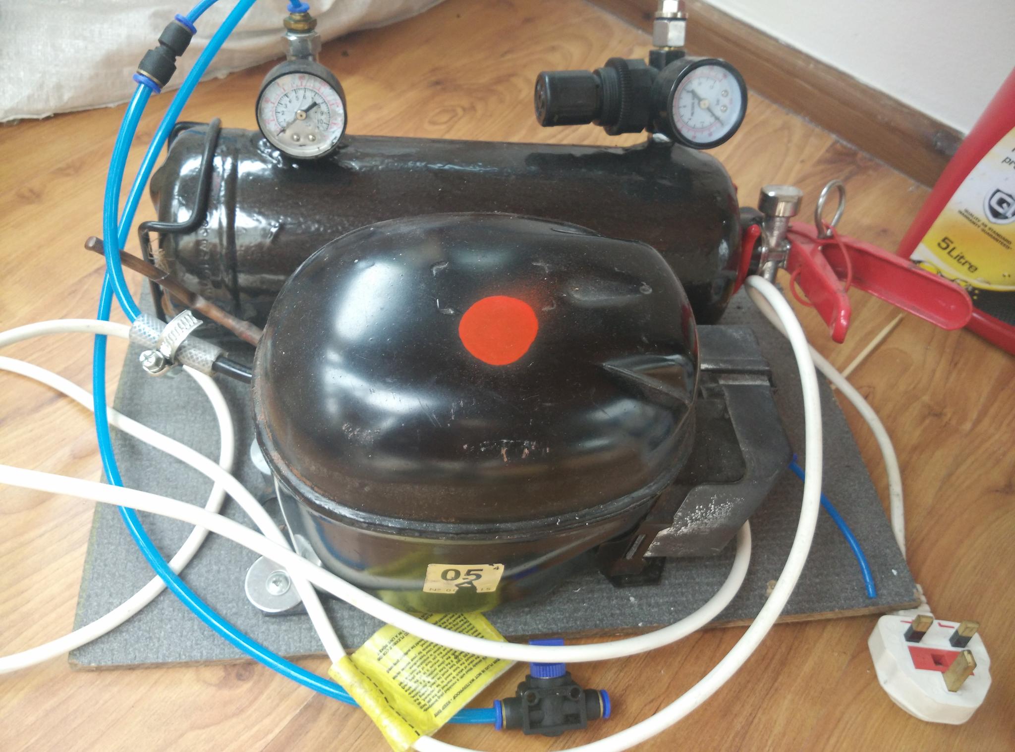 - little compressor made from fridge refrigerator, and fire extinguisher.