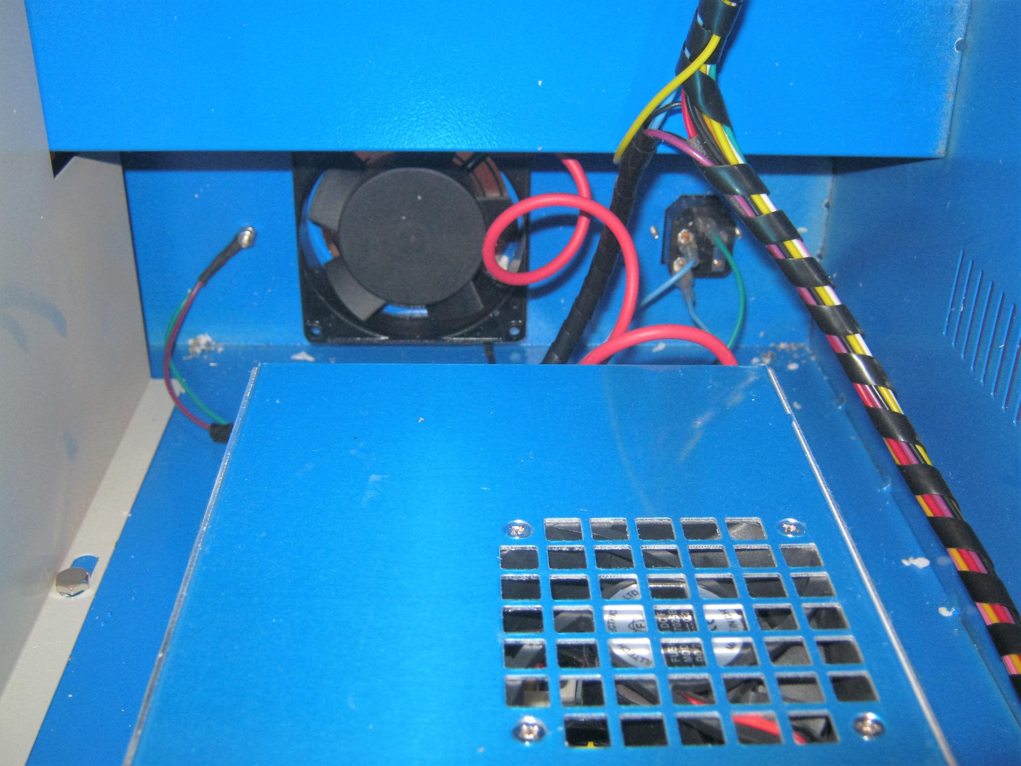 Bonding straps?, just crimp a couple of eyelets onto the ends of some 2.5mm stranded copper wire with yellow/green insulation and bolt from a single star-point bolt fixed through the steel chassis (look to see if the ground stud provides a suitable earth), the other end onto each hinged/bolted panel (so, main lid, the removable control panel lid, and maybe the rear laser enclosure lid), having cleaned the paint off the steelwork on each panel (don't rely on the bolt to provide low-resistance path to the panel), tighten, then if you fancy, a dab of hammerite over the top to stop corrosion.