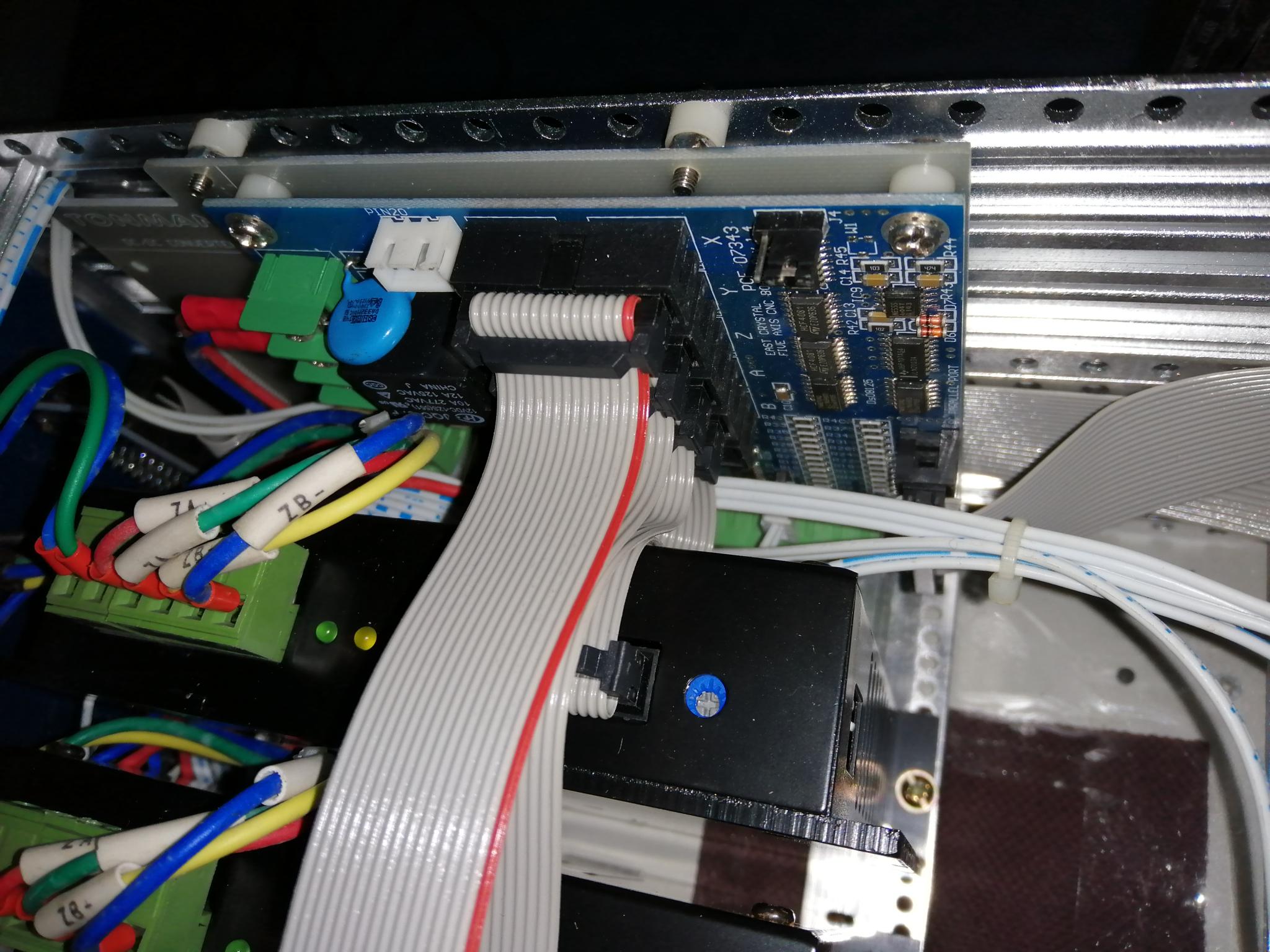 Ok nowhere do I see a Parallel port cable but I do see an Ethernet Cable going to what looks like a Controller board with ribbon cables going to Breakout board so are you sure it's using Parallel port.?
