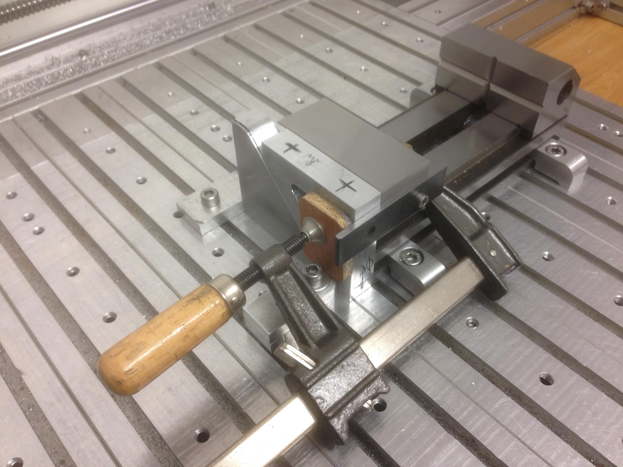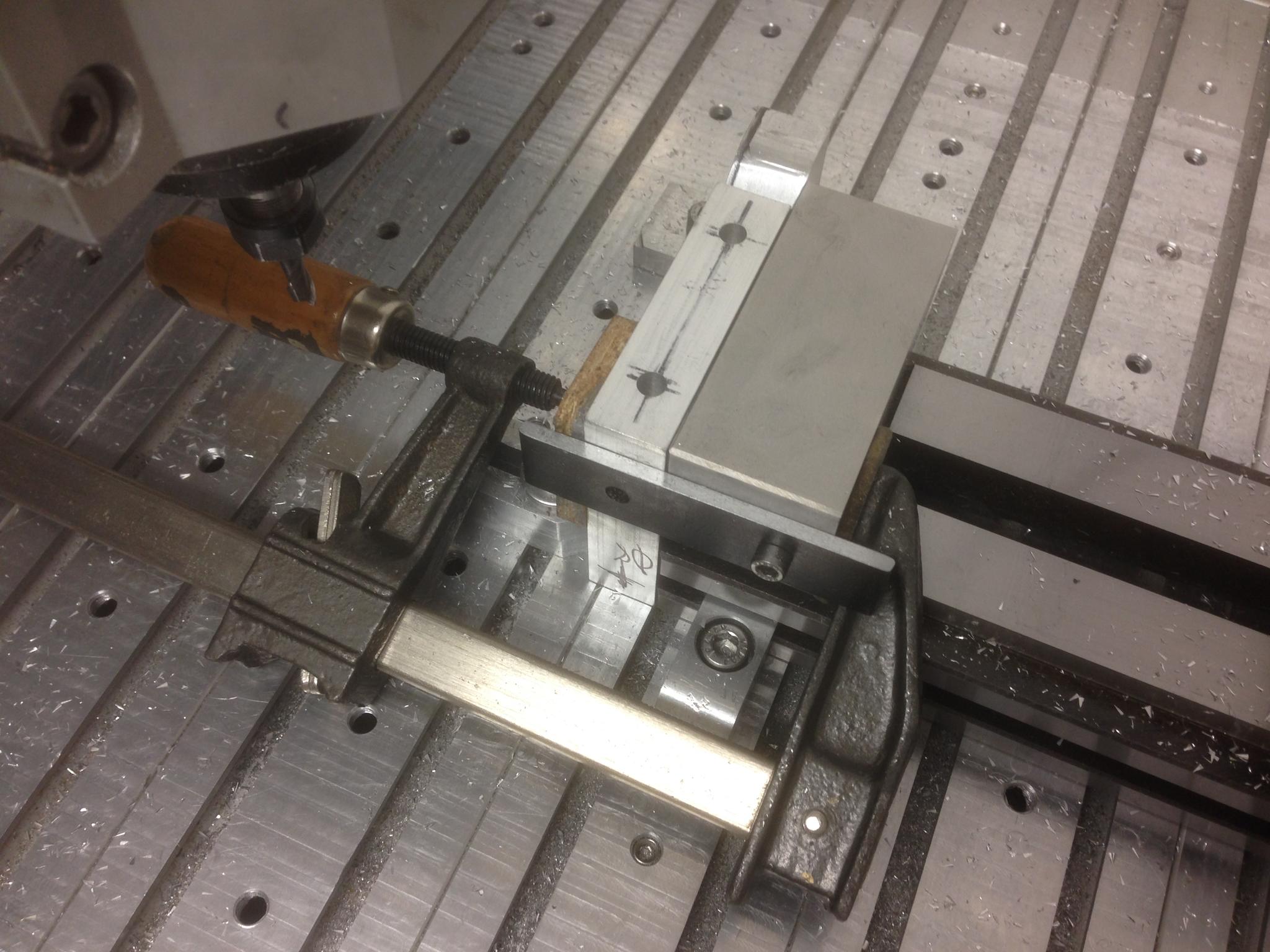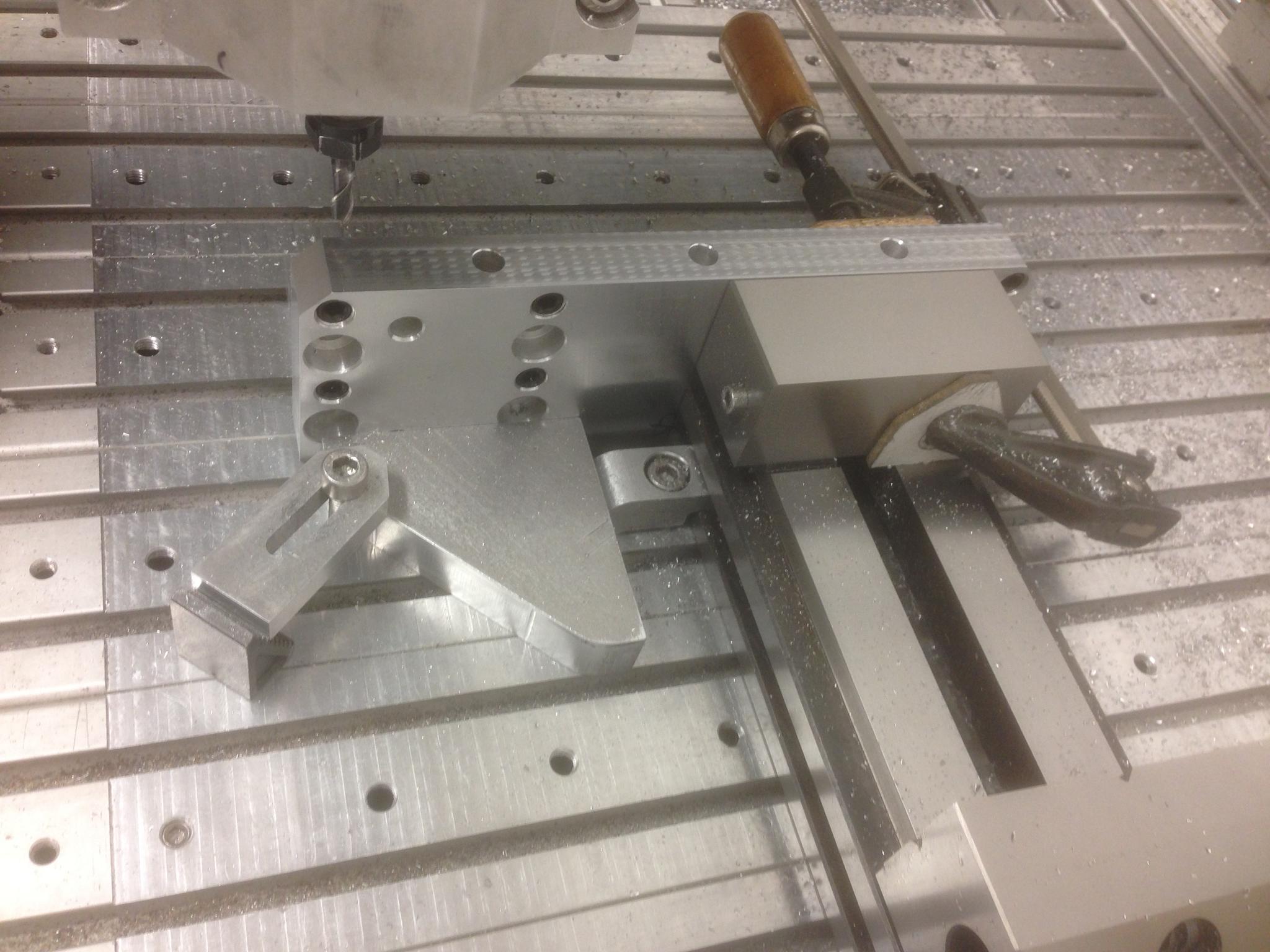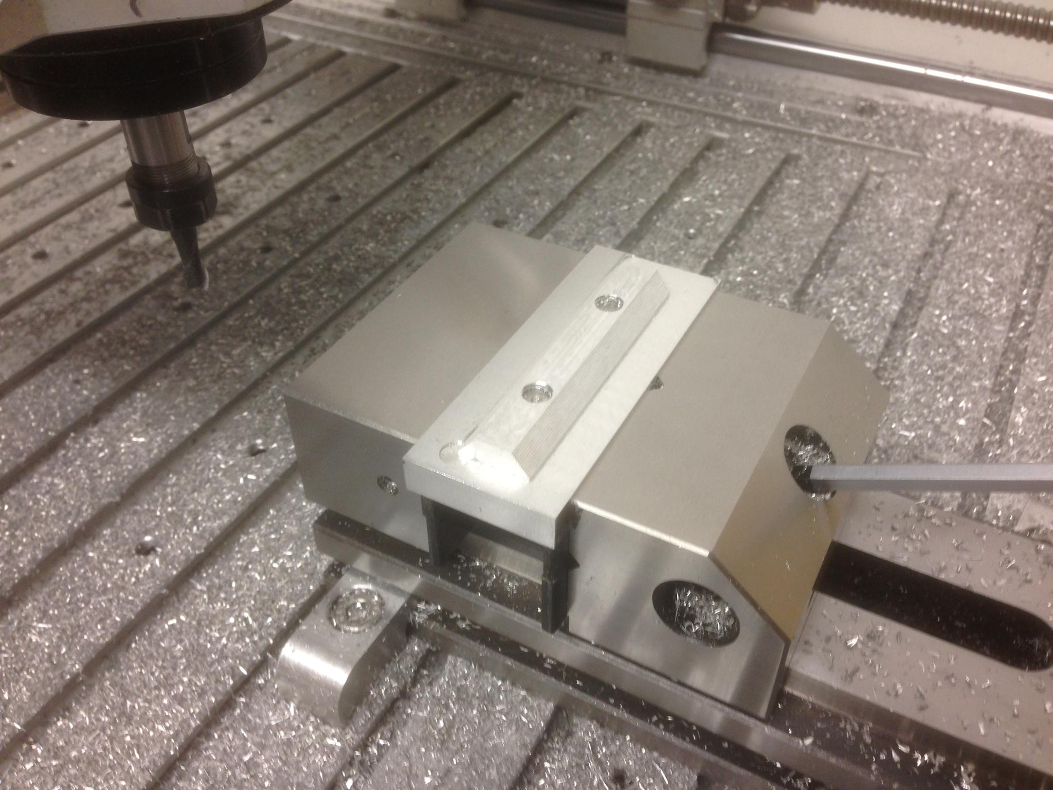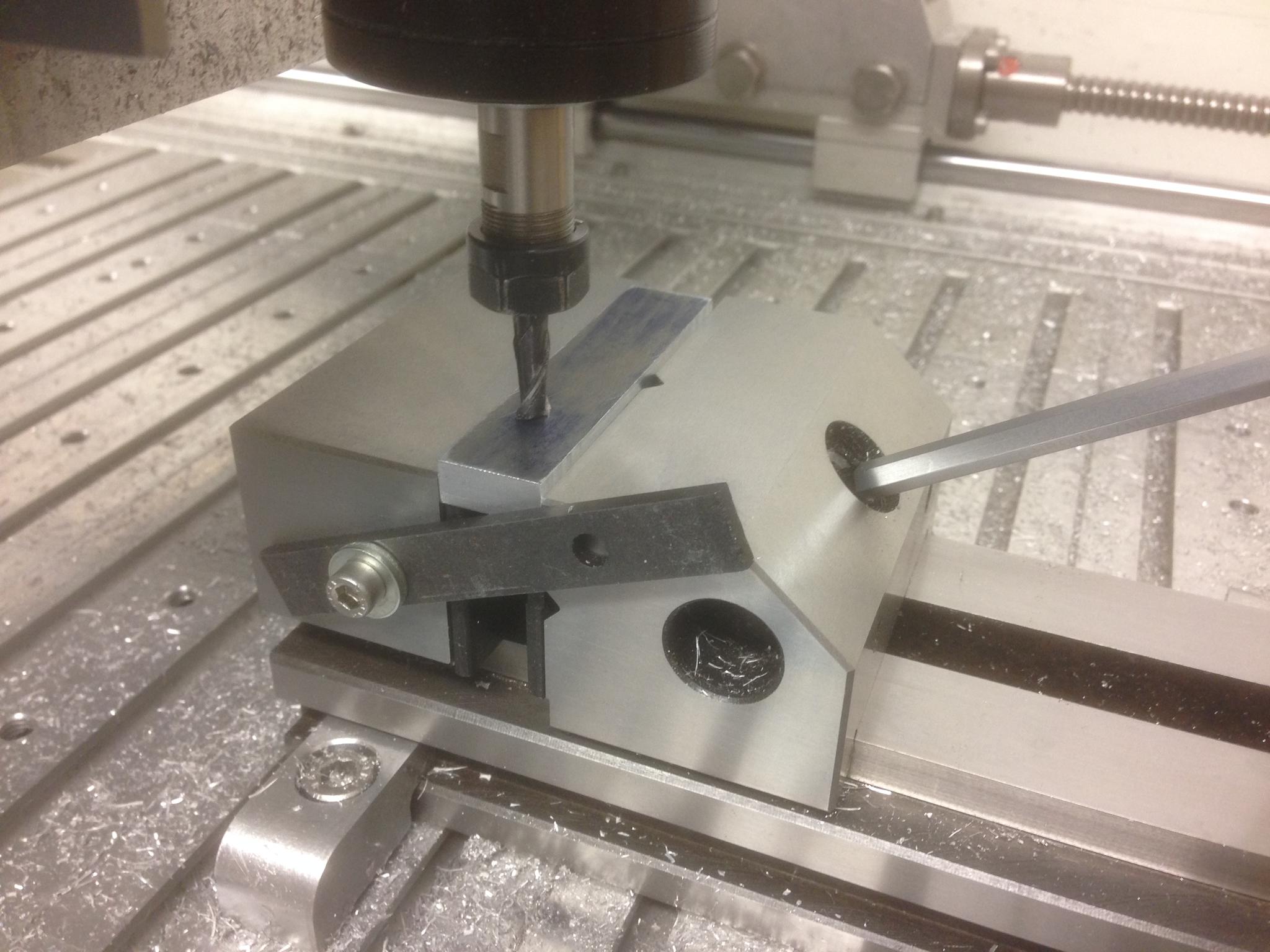 The vertical angle is held by the precision vice, with a backstop at one end. The part just drops in and is then clamped. I was just about to hit cycle start and I was called away ! So it will have to wait . . . .