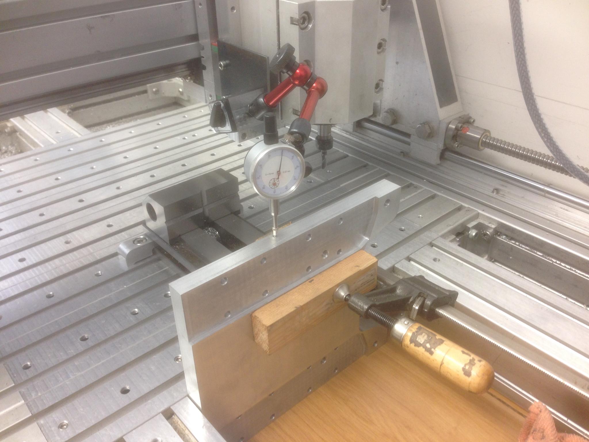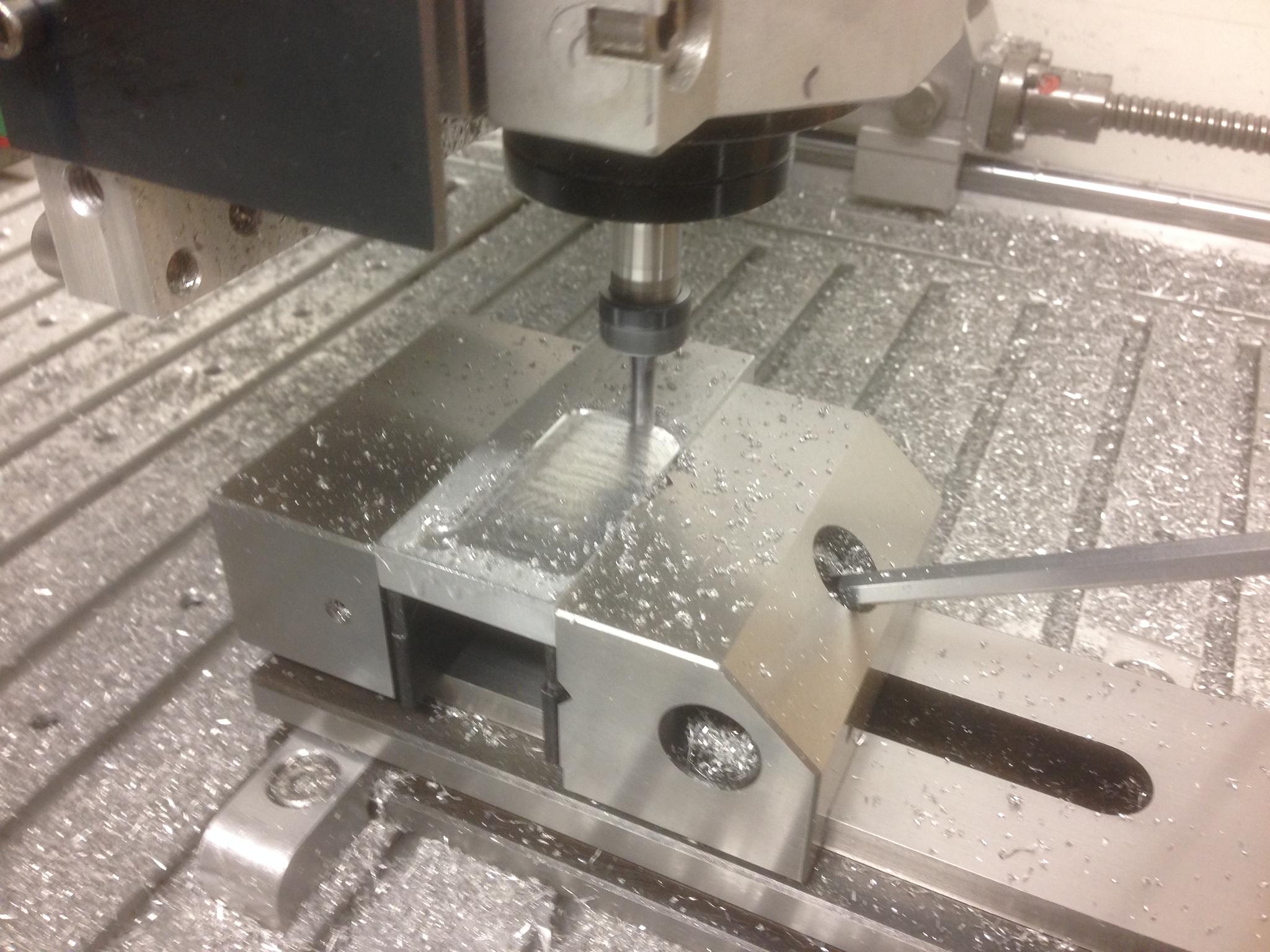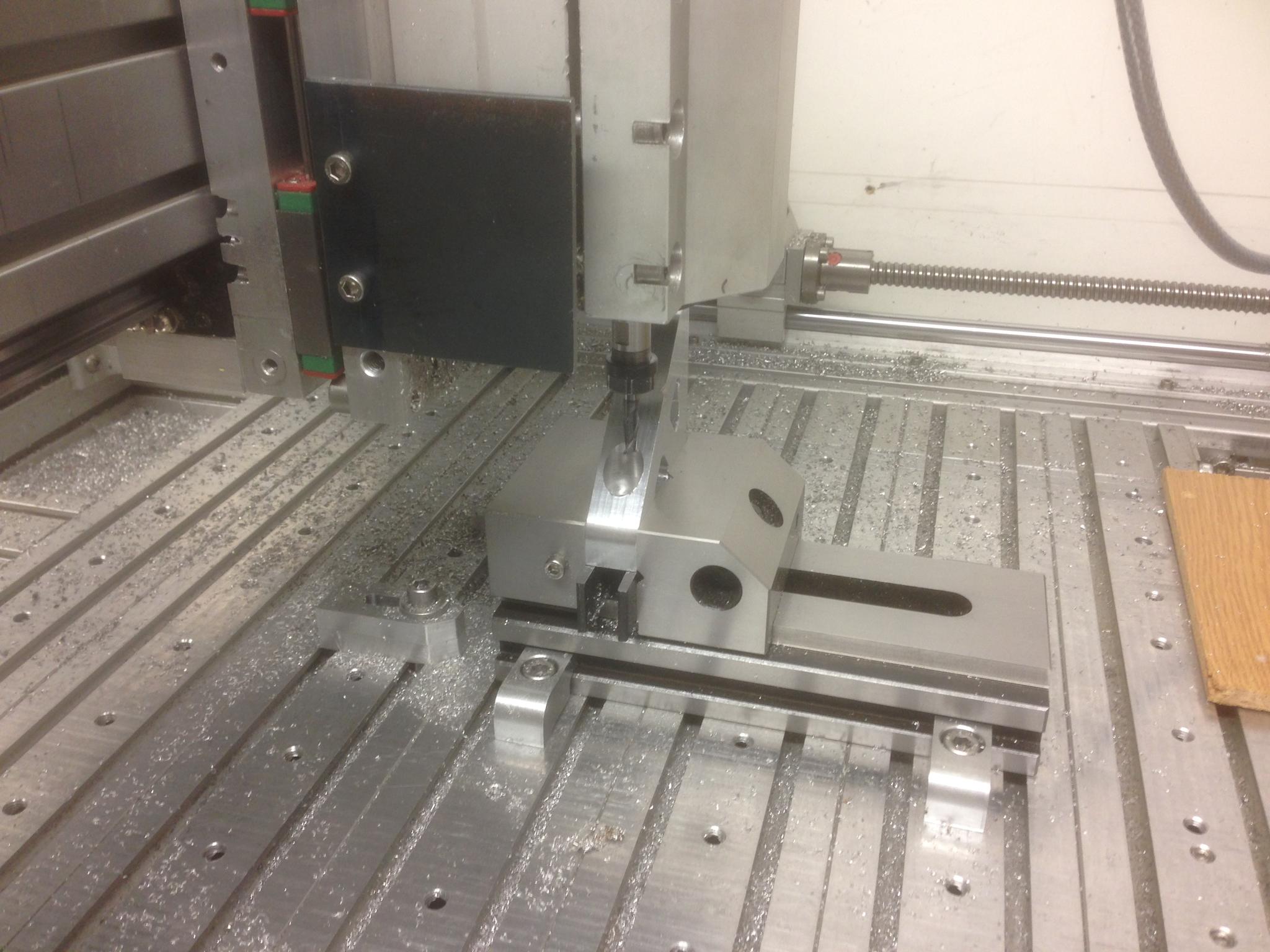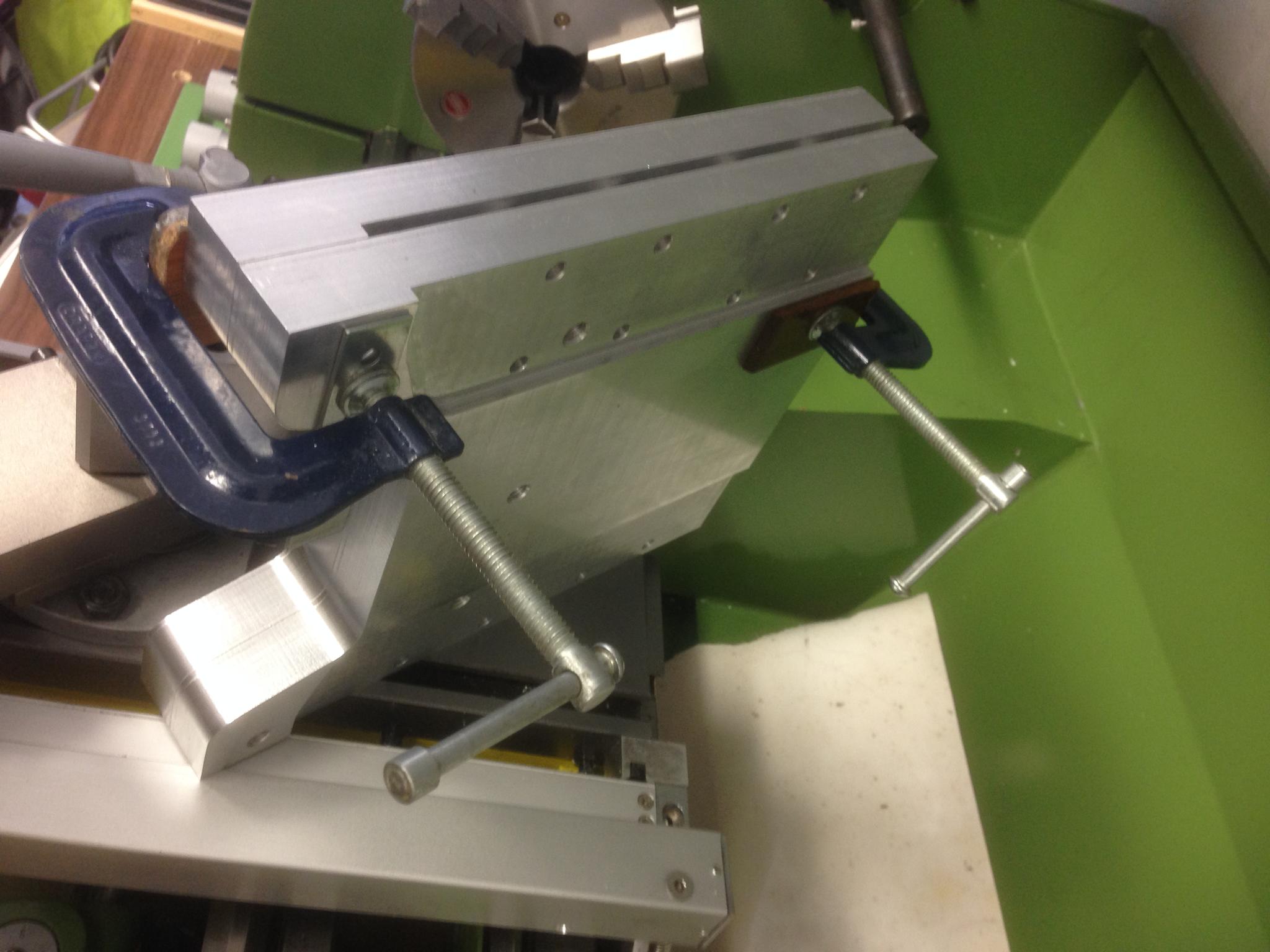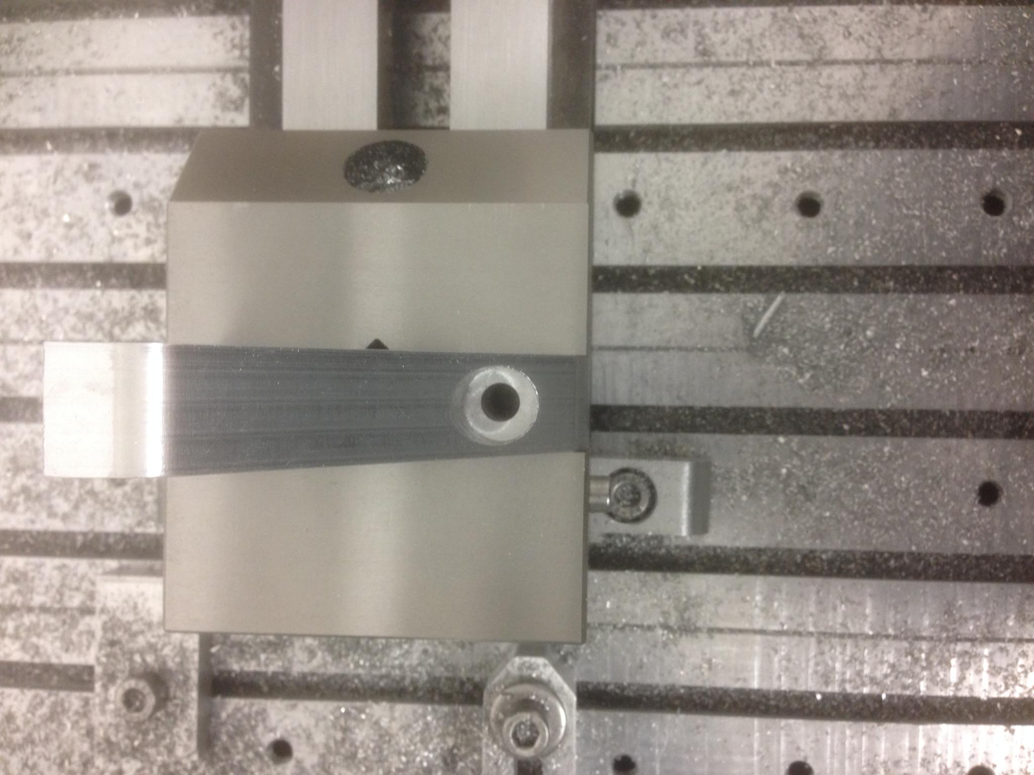 The vertical angle is held by the precision vice, with a backstop at one end. The part just drops in and is then clamped. I was just about to hit cycle start and I was called away ! So it will have to wait . . . .