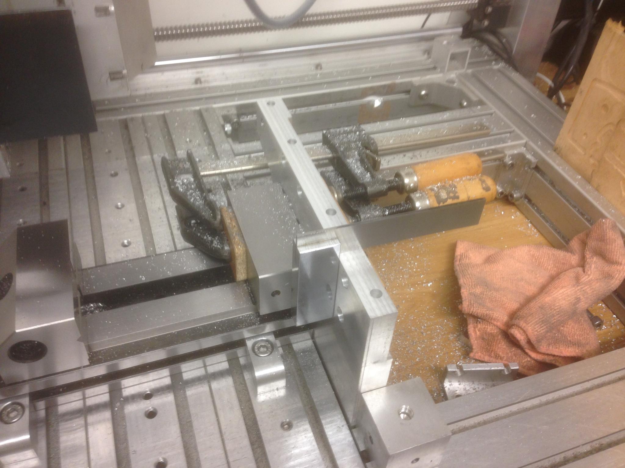 Luckily I had planned ahead (!?) and the first triangular brace I made with the poor surface finish could be used as a support. It will be sacrificial as one of the ops will cut into it.