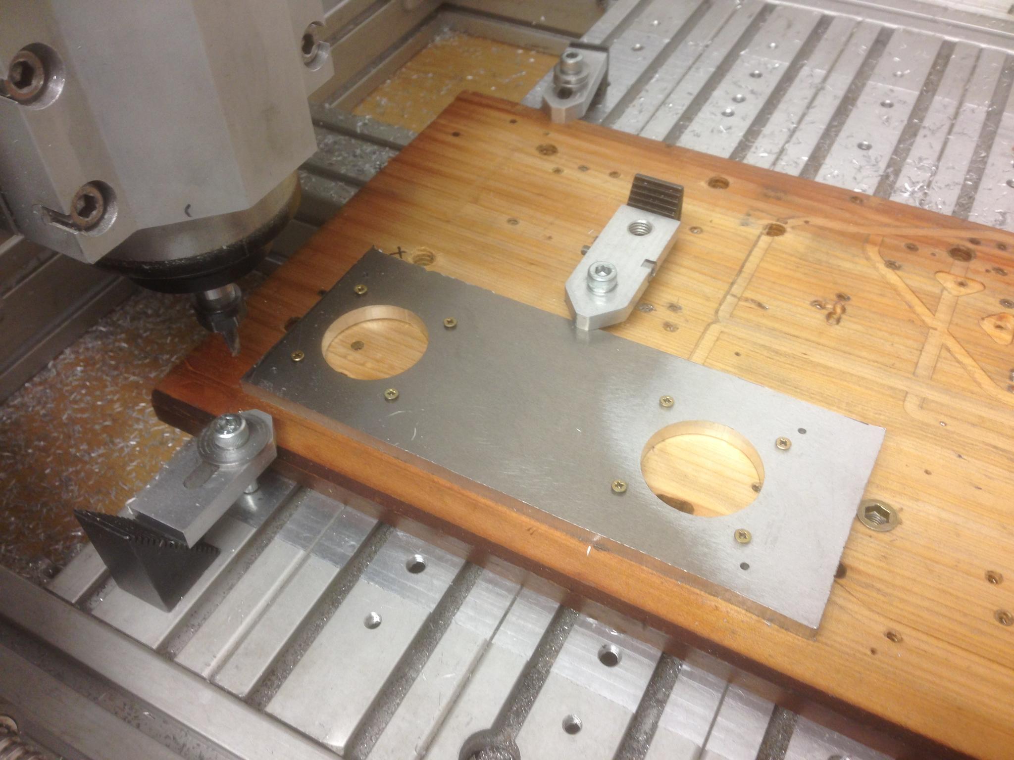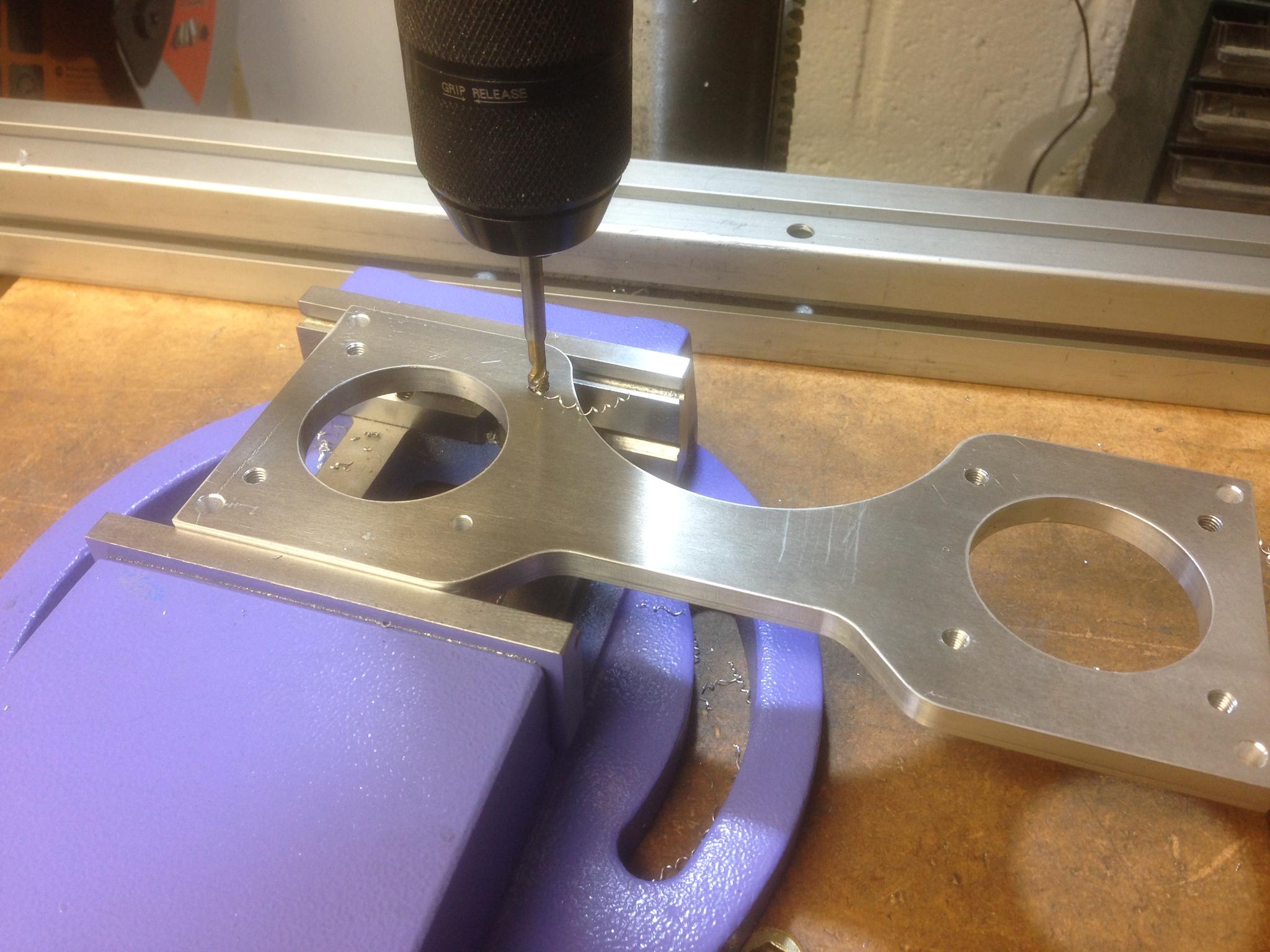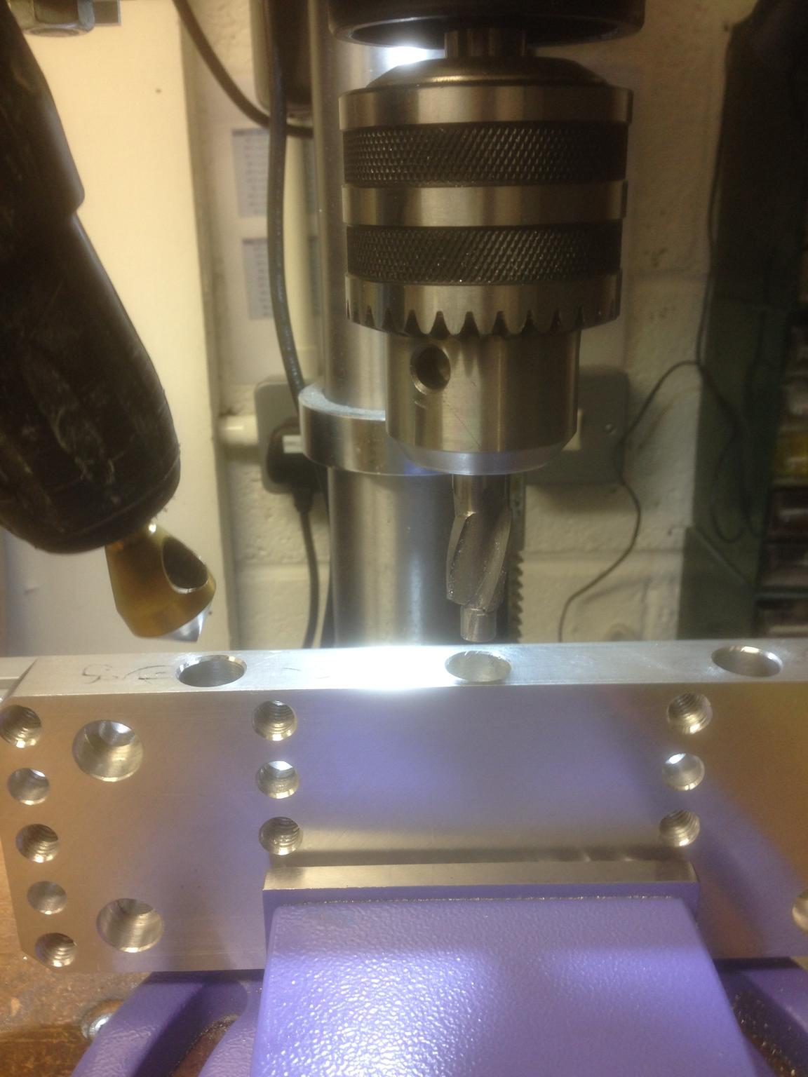 Two of the holes need to be M8 tapped, and one is a clearance + counterbore. Here is the counterbore being done.