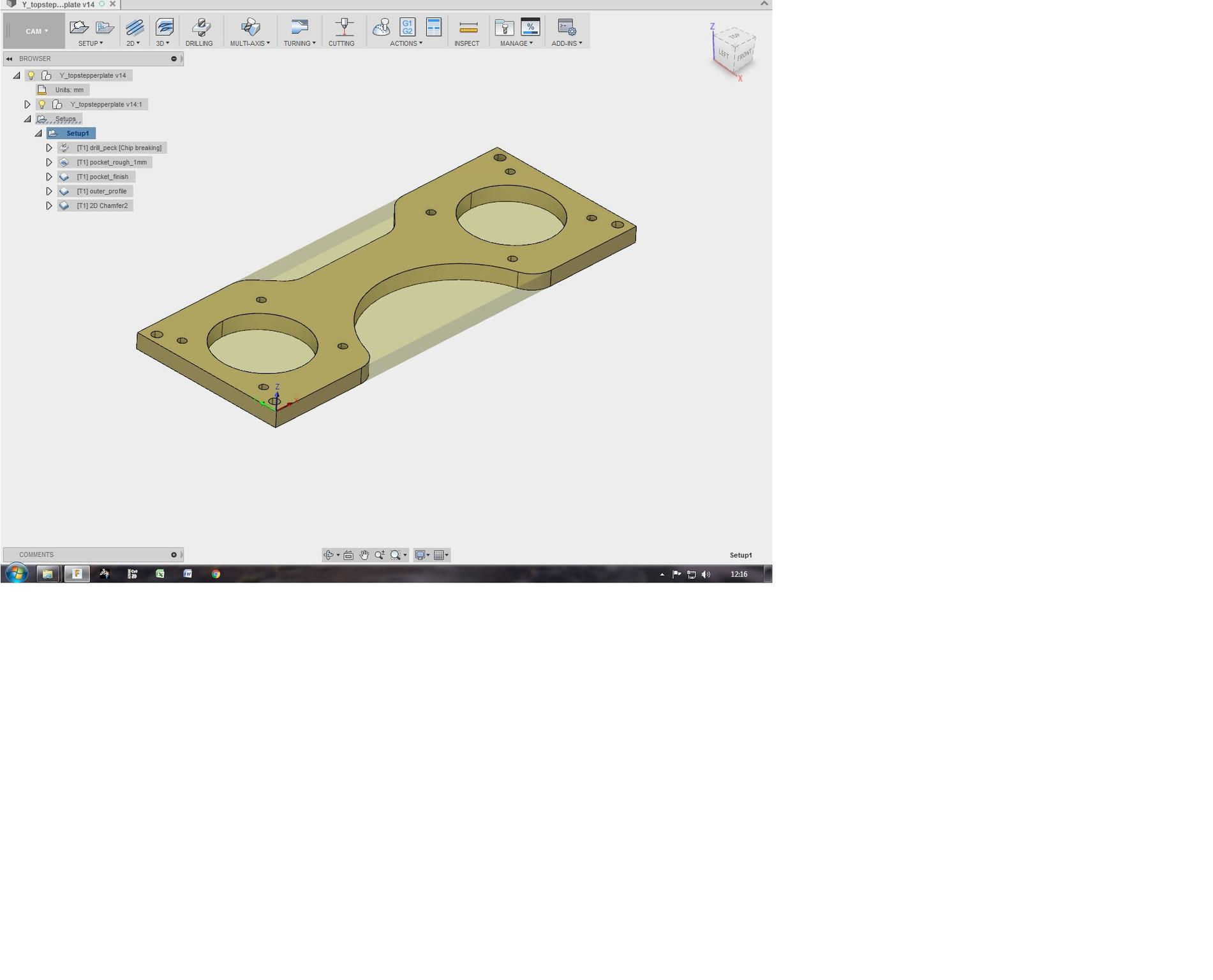 Onto the Z stepper mounting plate, which will hold to the 2 stepper motors. First time using Fusion360 so a bit worried about how it would turn out (didn't need to worry as it turned out and have not looked back). Exported the part as an IGES file from my CAD programme and used F360 for the CAM. Very impressed with it. Here is the part to be machined: