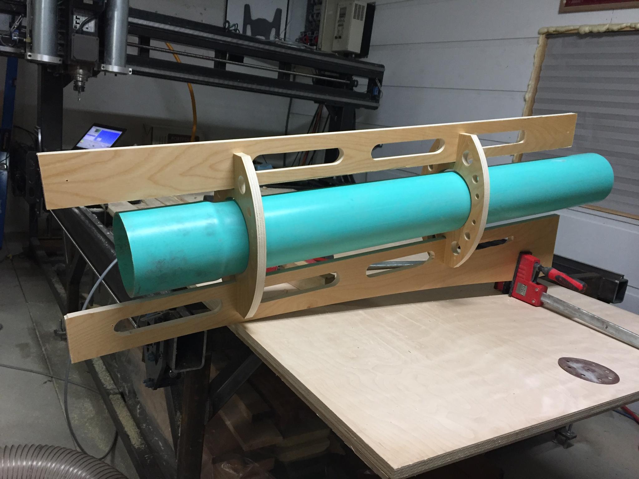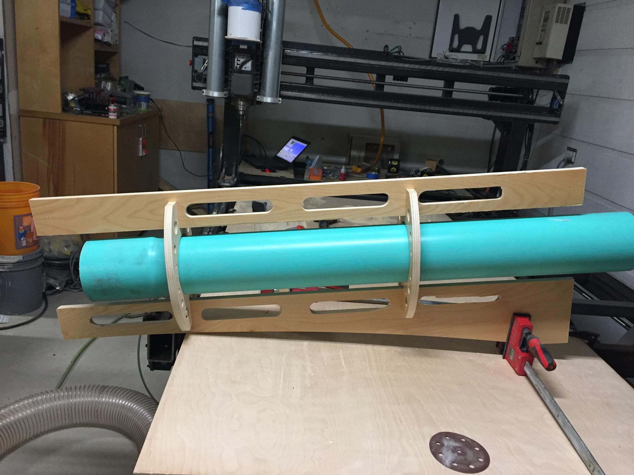 Turned out pretty good for the first cuts, here is a final picture and the first 1/2 of the dust collection adapter laid up in fiberglass.