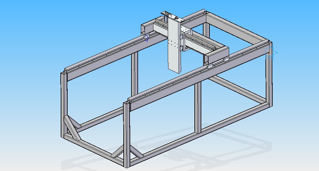 In that drawing I've discarded the tall gantry sides and replaced it with a bit of 100x60x3.6mm steel box section, so now the 'gantry' is only 100mm tall, not several hundered mm. This should help with the stiffness.