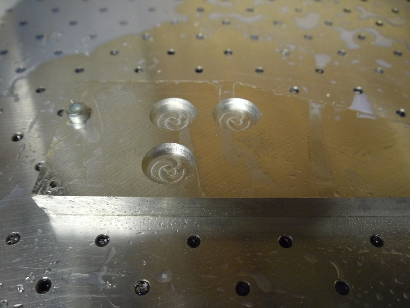 Did a few test cuts, 30mm dia pockets at 5mm deep, cutting 1mm at a time with a 6mm HSS 2 flute slot drill. Spindle running at 4000rpm with a feedrate of 800mm/min. Noticeable difference now it is flooded with coolant.