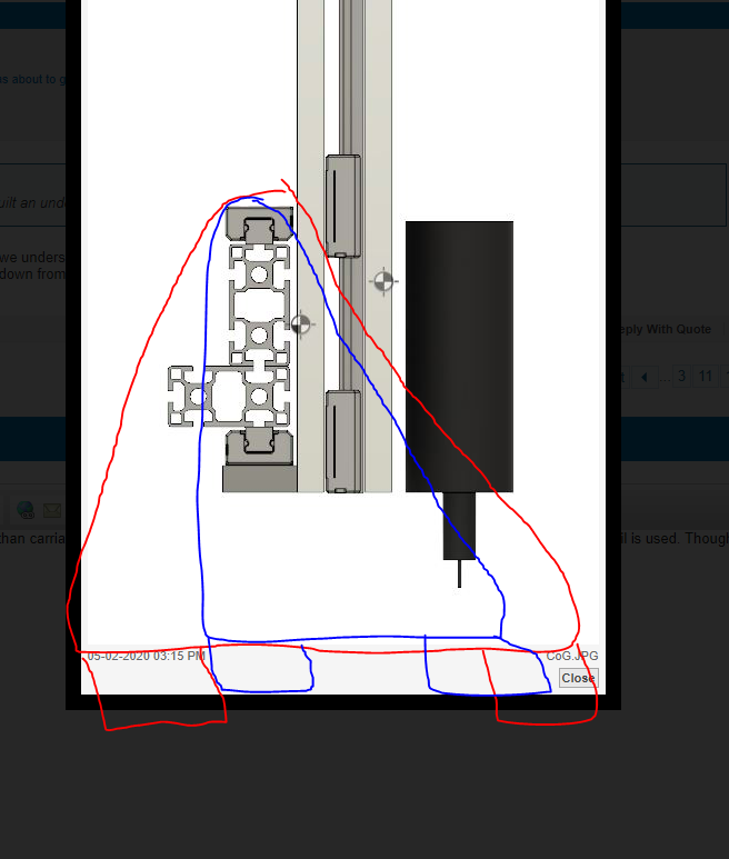 My thinking is that any force applied to the spindle in the X direction affects the balance of the entire gantry assembly. Now, the reason I'm double checking this is that when drawing the gantry assembly (as in the attached, albeit, unfinished drawing) I find that the COG is quite far back (the left side mark) if the beam is also included in the calculations. I know some parts are still missing from the drawing, but even when included, the end result will not change much (in fact, what's missing is mostly parts on the left hand side of the mark). Bottom line is, in this scenario my gantry arms would raise straight up from the X-axis carriages (hence, neither would the inclusion of the arms affect the cog) and, essentially, leaving the spindle quite far in front of the front carriage.