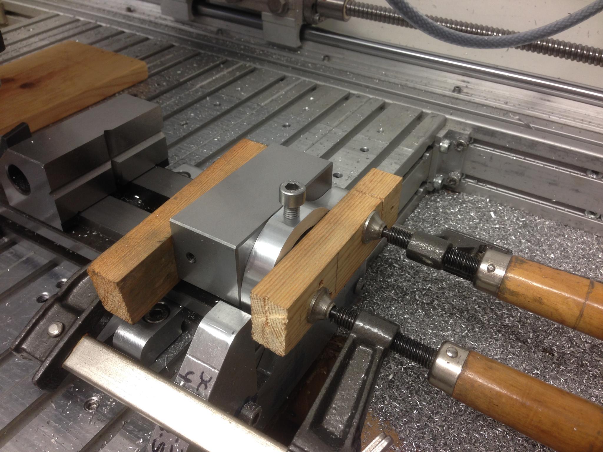 Then bolted down onto the top slide using the T-nuts I'd made for another fixture. The M12 bolts are a bit long so will need to cut them down. They will hold onto the side of the spindle block which already has M12 holes in it. There are some random threaded holes in the part but they were in the piece of scrap I made the part from: