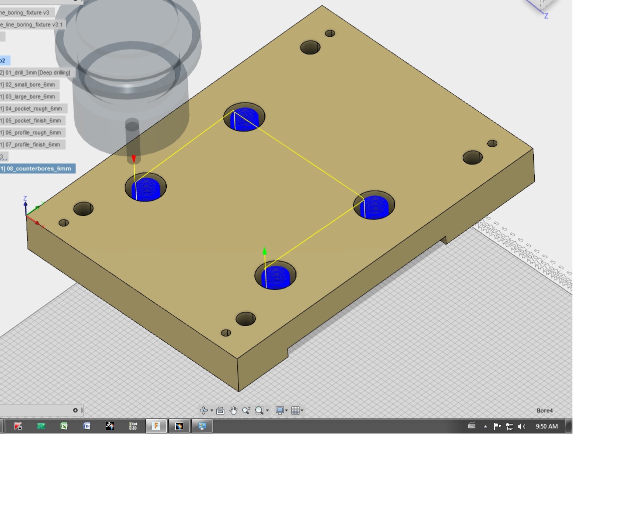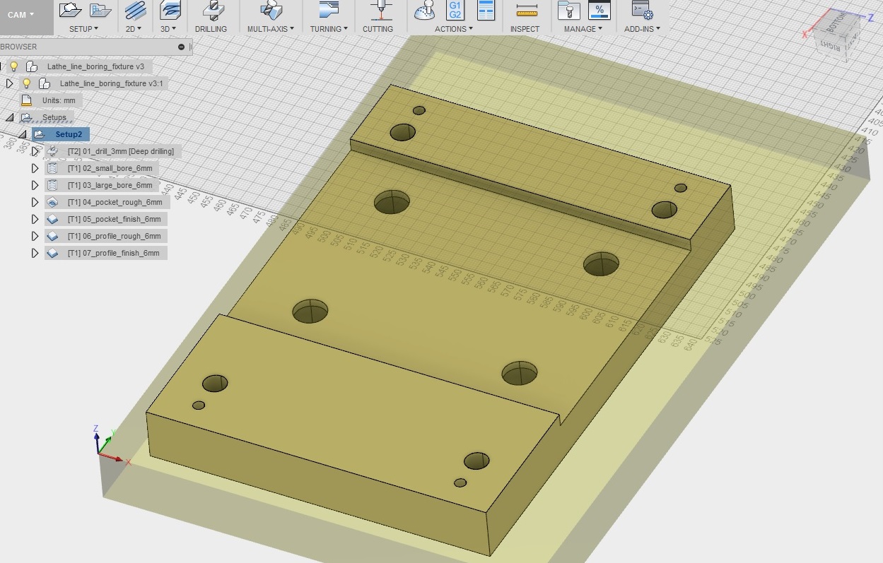 The last part to make is a fixture to hold the spindle mount in place on the lathe cross slide. This will bolt down onto the T-slot nuts, and bolt up into the underside of the spindle block using the existing M12 tapped holes. The key feature is that it will have M5 grub screws at each corner to provide adjustment vertically (bore centre MUST be aligned to lathe centre height), and to provide adjustment in tilt in 2 directions. Essentially a tramming plate to get it all lined up. Here is the CAM: