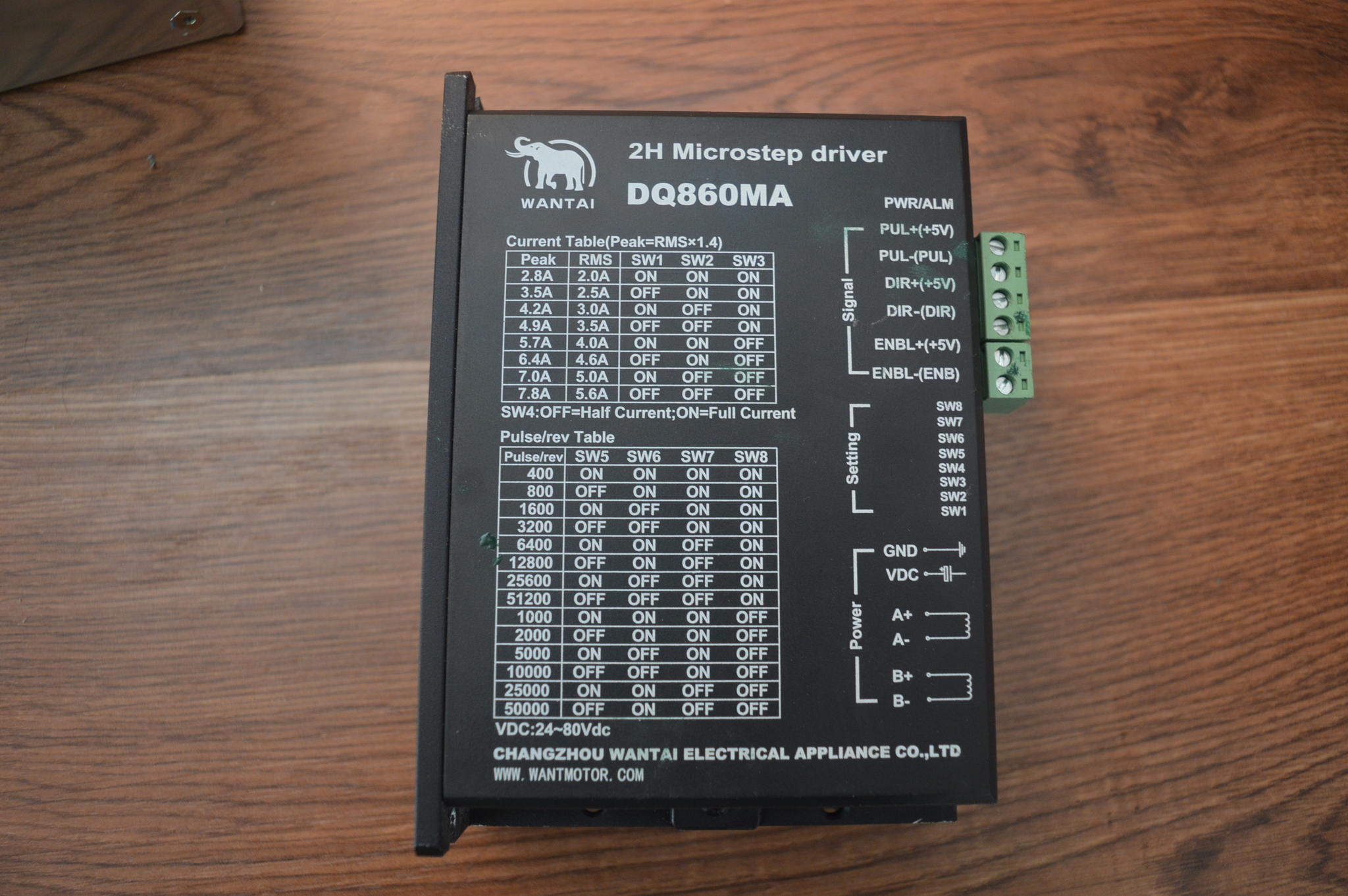 The drivers are DQ860MA, 24-80V, set at the 4.9A Peak, 3.5A RMS option at the moment. The steppers have written on them 5.6A(U). The next driver setting is at 5.7A Peak. They go up to 7.8A Peak.