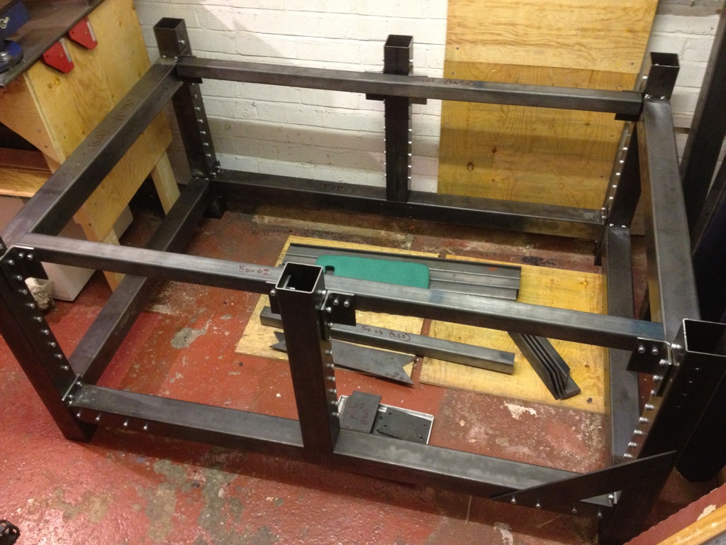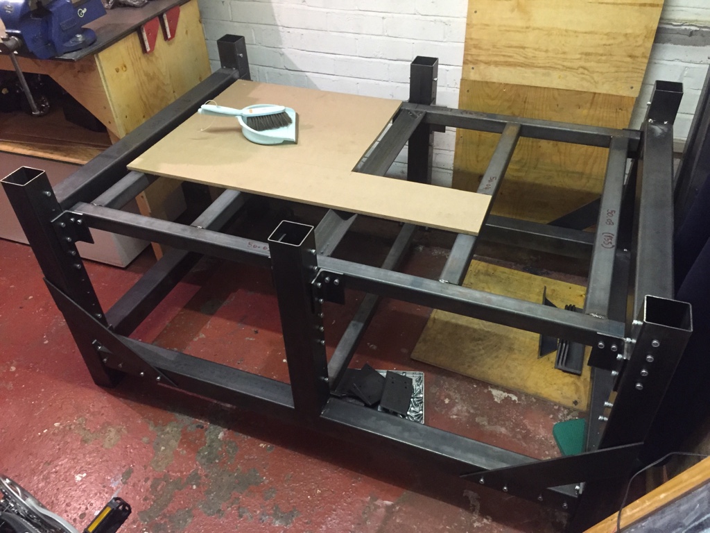 Further frame progress - pretty well tacked up now. I will take it apart into sections to fully weld the joints and add the gussets. This was one of the reasons for bolting large sections together - it avoids too many awkward welding positions...