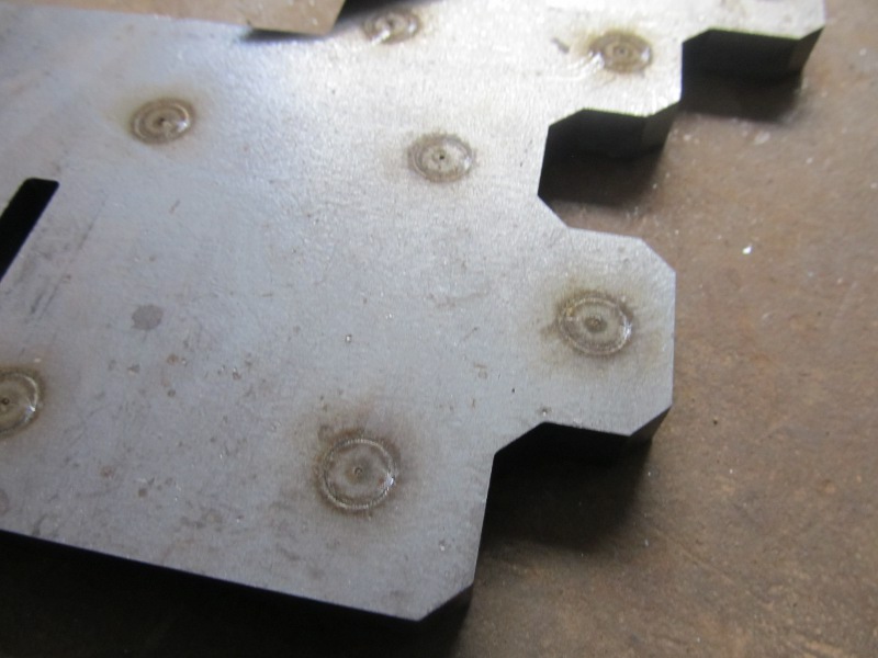 Now move to one end the gantry and spot weld with 5- 6 spots 1 of the pieces in blue from the first picture. Rotate by hand the screw and move to other end of machine. Now you spot weld the other fixture.