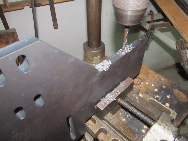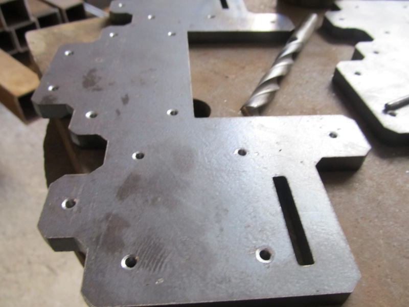 At the following photo you can see two pieces that will be bolted together. The upper piece will be welded with the gantry tubes and then it will be bolted with the lower piece. The holes of the two pieces should be excactly coeficient so i drill the upper piece an the i put the one piece over the other to mark the ceter of the holes
