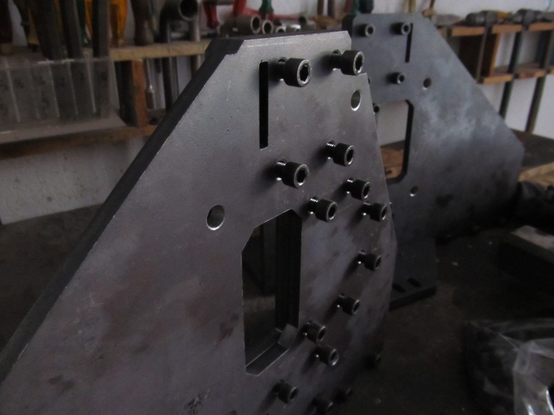 After i bolt the side parts i start to work with the gantry. I put the two side braces on the table and then i attach the vertical 10m plate.