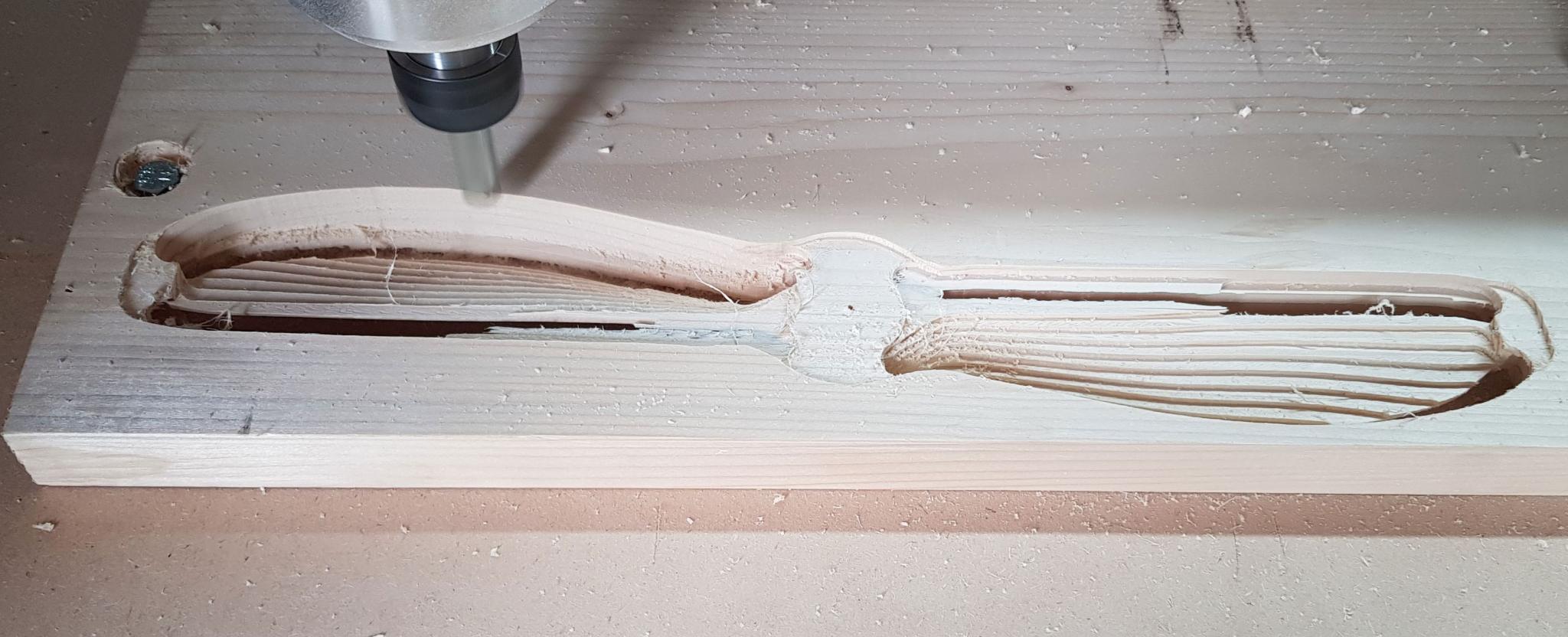 Also spent some time trying to improve my 3D CAD skills - mocked up a Sopwith Camel prop, and tried a 3D carve. The router did an amazing job (its about 600mm wide) - I really love how smooth and flowing the contour is after a single finishing pass with a 6mm ballnose. The only issue I had was that I messed up the CAM and only got half the model (oops). Before this cut I was slightly worried about if my Z axis was okay - one of the earlier 3D carves had some suspected lost steps - but it handled this one perfectly. Cooling is definitely a need-to-fix item on my agenda though - that little pump just can't cope with the length of cooling loop I've got, and after about an hour the lower section of the spindle was hot (still comfortable to touch, but I'm guessing it shouldn't build up heat if the cooling is working well).