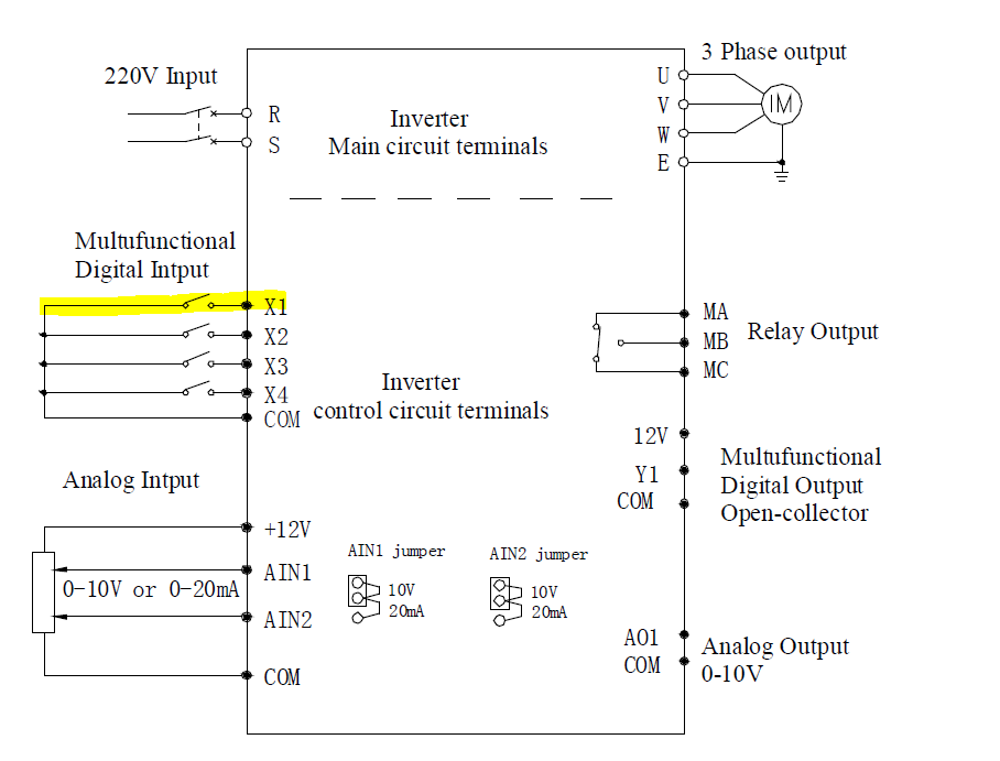 However if you have the simplest 3kw inverter like the diagram below, care should be taken what voltage flows there. So if you board is 5v and the inverter is 24v or vice versa. Best would be that you have an Estop button with double switch circuit or you just use an enable output on Mach3 and a relay on your BOB.