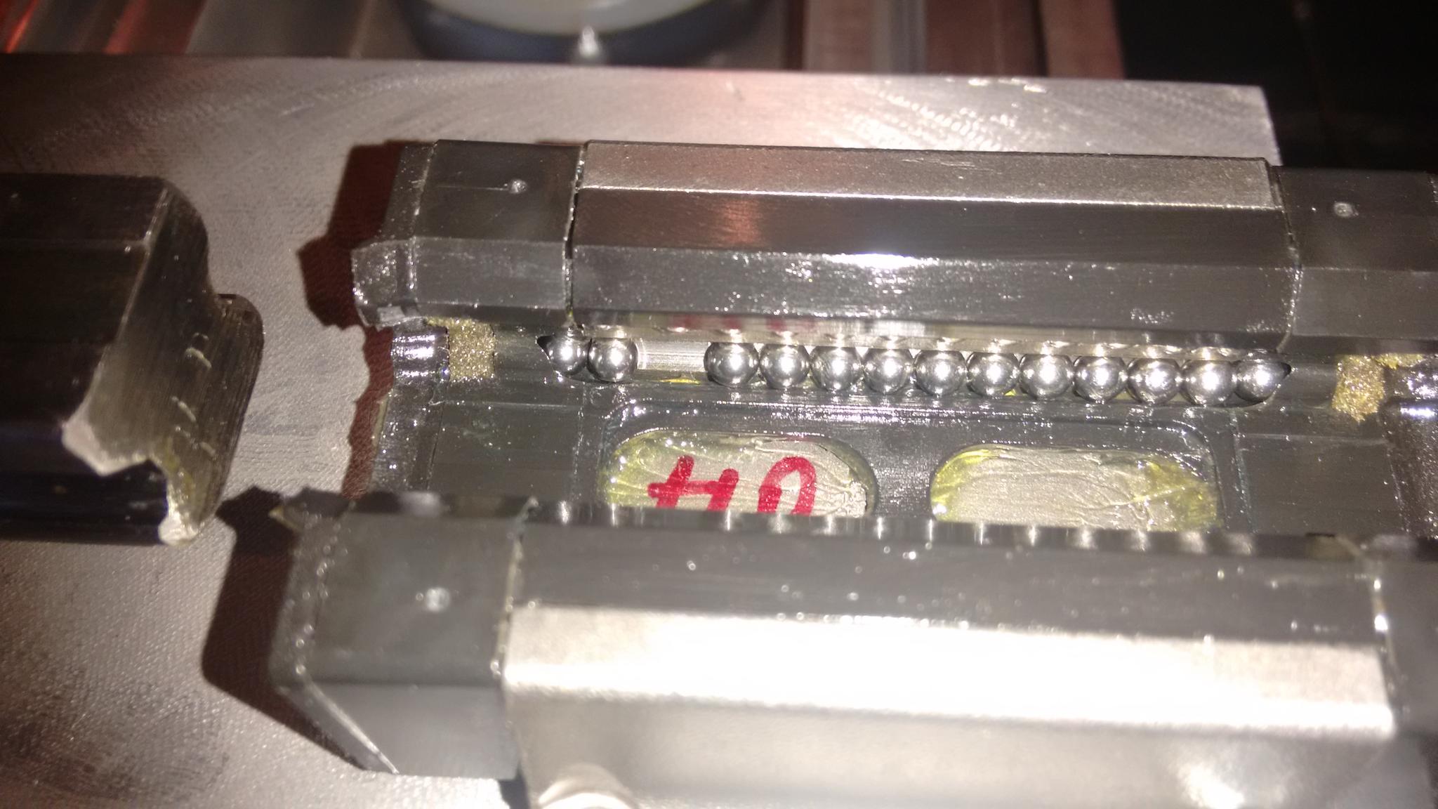 But it's not moving very freely, I have clocked the rails up within 0,01 and put it all together including the ballnut and tried to push it up the rails, I could just about move it but it didn't feel very nice, I took the plate off and greased the carriages, and tried the rails on there own. one felt lovely and smooth but the other felt notchy on one of the carriages. So I carefully removed the rail and it appears as though I have a ball bearing missing!
