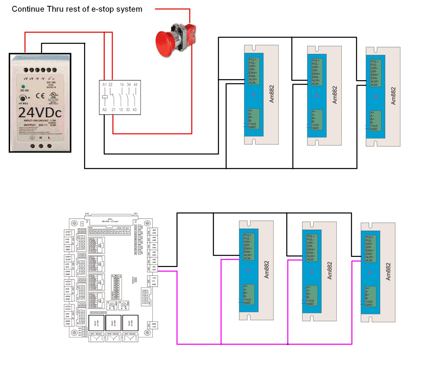 Thanks for that Jazz, i got totally confused trying to accommodate a hardwired circuit with the e stop and an alarm input to the BOB( both versions of what you have sketched). my BOB has a dedicated input for force turning off the ENABLE, at least i think that's what it does. i'm trying to use just 1 relay and as it stands and i have that in the PSU & e/ stop circuit. I have updated the dwg to reflect what i think is your schematic. i probably don't need an input from the alarm drives to the BOB. i got caught up in thinking that an input to MACH 3 was required. i also had a look at Eddies dwg and saw that the alarms from his drives were in series so that added more ??????. as in connecting a ground wire to the positive terminal of the alarm drive and out the negative terminal and on to the next drives positive terminal etc. that really had me confused along with a dose of the flu which got my head in a spin. i don't need an e/stop signal to the BOB so on reflection , or do i?