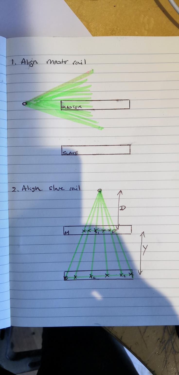 I have had an idea, or maybe remembered something previously discussed here. To get around the error in the laser line which is proportional to arc length how about first flattening the master rail in isolation with the laser projecting along the rail, this uses less that 1 degree of laser arc. The master rail is now flat. Now move the laser so it is orthogonal to the master rail and projecting across the frame as to encompass the slave rail we want to bring into plane with the master.