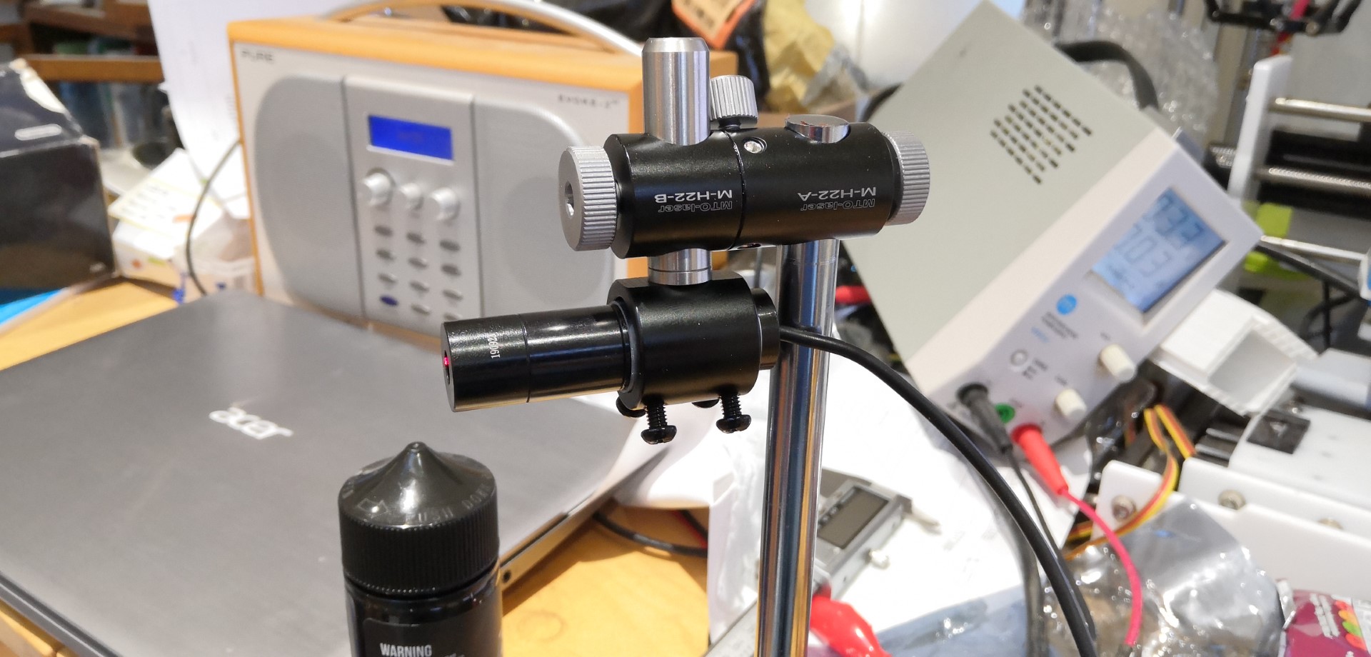 I think this laser needs to be clamped to a vblock attached to a lump of iron. It also has a focusing ring attached which works well other than it wobbles the laser all over the place. This might need to be locked in place as well.I have now gone from 'borrowing' the laser to owning it so it might well get some locktite on the focus slider.