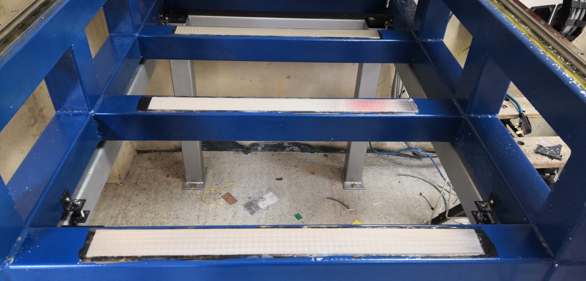 I'd rather have the bed closer to planar that this, although the eventual spoil board skimming will fix it, so I'm contemplating attaching some shimming material to the cross members and surfacing this then bolting the bed plate down on top.