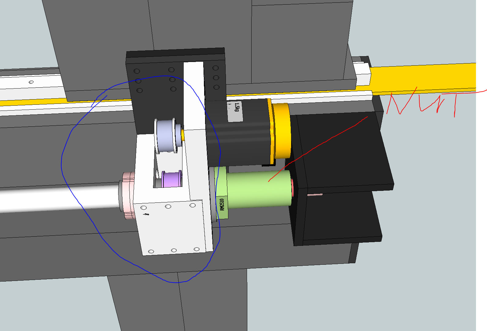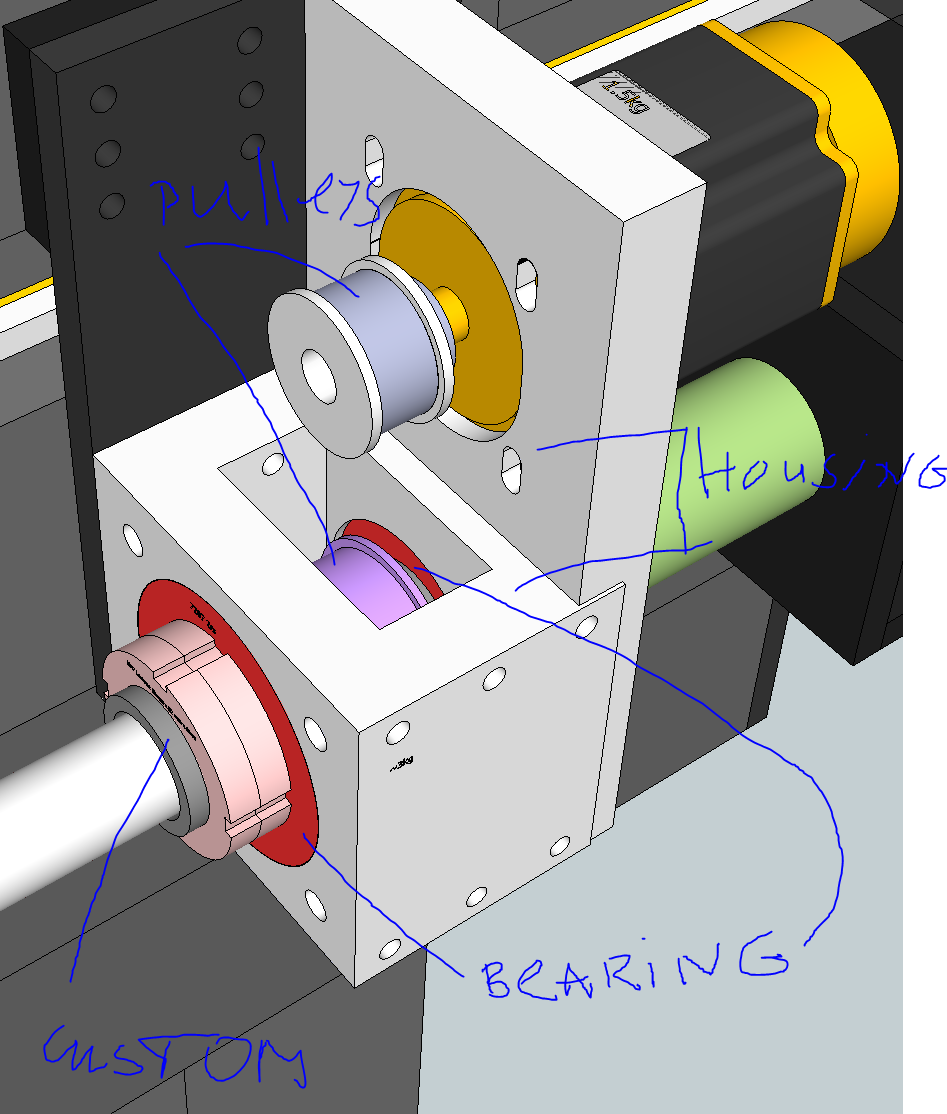 On first picture bellow you see the support, welded from 10mm steel. This is same both sides. Pink part is M20x1 thread for locknuts at the end of the ball screw. The mount hole is wider so when gantry moved by hand to each end by 2 people rotating the nuts